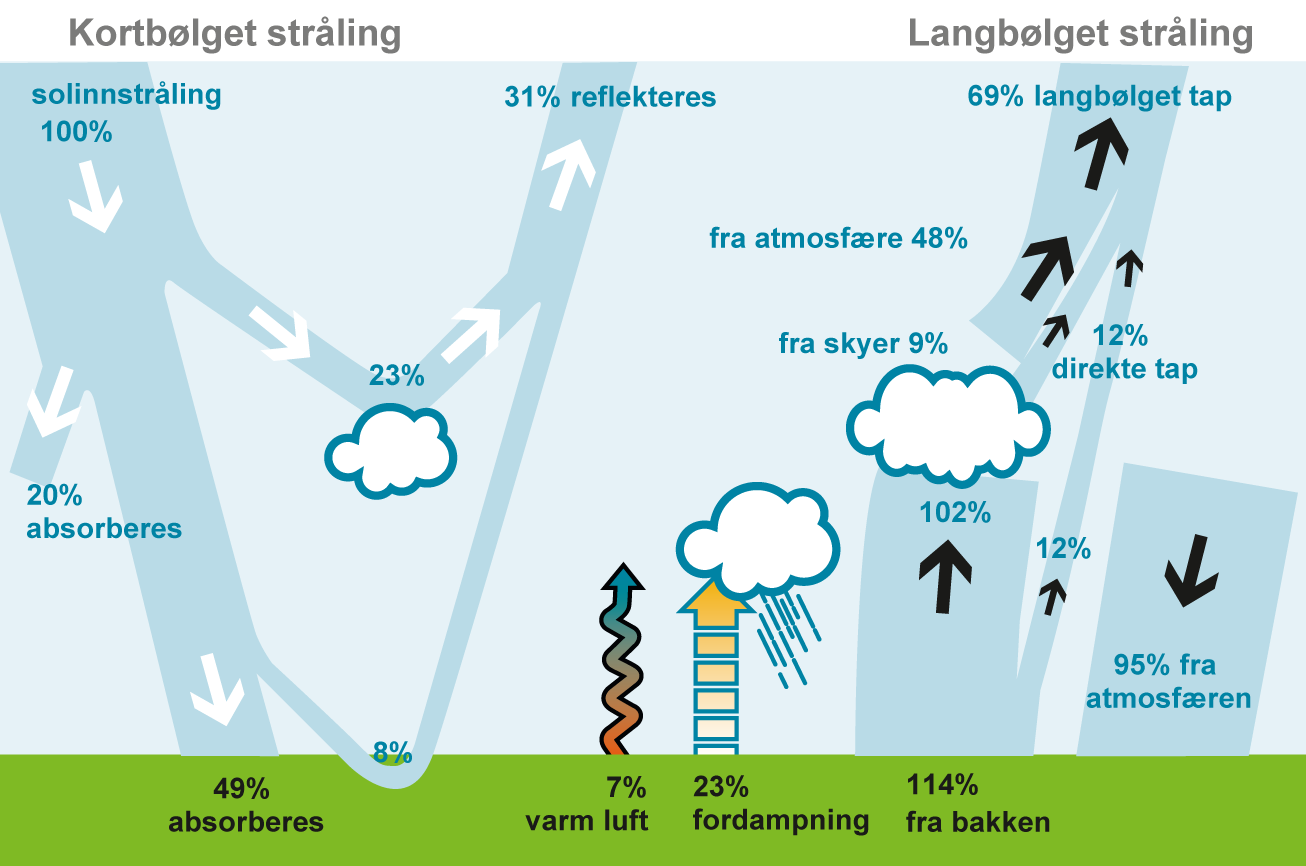 Figur 4.4 viser jordas energibalanse, som styres av innstråling fra solen, atmosfærens sammensetning og refleksjon fra bakke og atmosfære. Omlag halvparten av solinnstrålingen blir absorbert av jordas overflate. Denne energien transporteres til atmosfæren ved å varme opp luften nær bakken (rød-blå pil), fordampning (gul pil) og ved langbølget stråling (sorte piler) mot atmosfæren. Her absorberes nesten all langbølget stråling fra underlaget, med unntak av en liten del (12 %) som slipper gjennom atmosfæren og ut i verdensrommet. Den absorberte energien fra underlaget varmer opp atmosfæren som så selv sender ut langbølget stråling mot verdensrommet fra oversiden og tilbake mot underlaget fra undersiden. Den langbølgete utstrålingen mot verdensrommet fra toppen av atmosfæren (69 %) er vesentlig mindre enn det som sendes ut fra bakken (114 %) mot atmosfæren. Denne reduksjonen i oppoverrettet langbølget utstråling fra bunn til topp kalles drivhuseffekten og den sørger for at gjennomsnittstemperaturen nær bakken blir ca 18 °C høyere enn den ellers ville vært. Størrelser er gitt i prosent av gjennomsnittlig solinnstråling. Figuren er basert på IPCC FAQ, figur 1.1, 2007 (Kvamstø & Sorteberg, 2021).