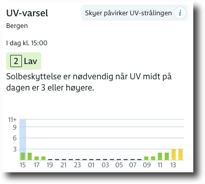 NILU2 har en egen tjeneste for varsling av UV-indeks, https://uv.nilu.no/, og Yr.no har inkludert UV-varsel på sine sider også (se figur 5.3). Men hva er UV-indeksen?