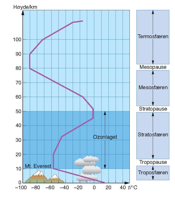 I kapittel 1 så vi på de ulike inndelingene i atmosfæren, og hvordan stratosfæren gjenkjennes ved at temperaturen stiger med høyden.