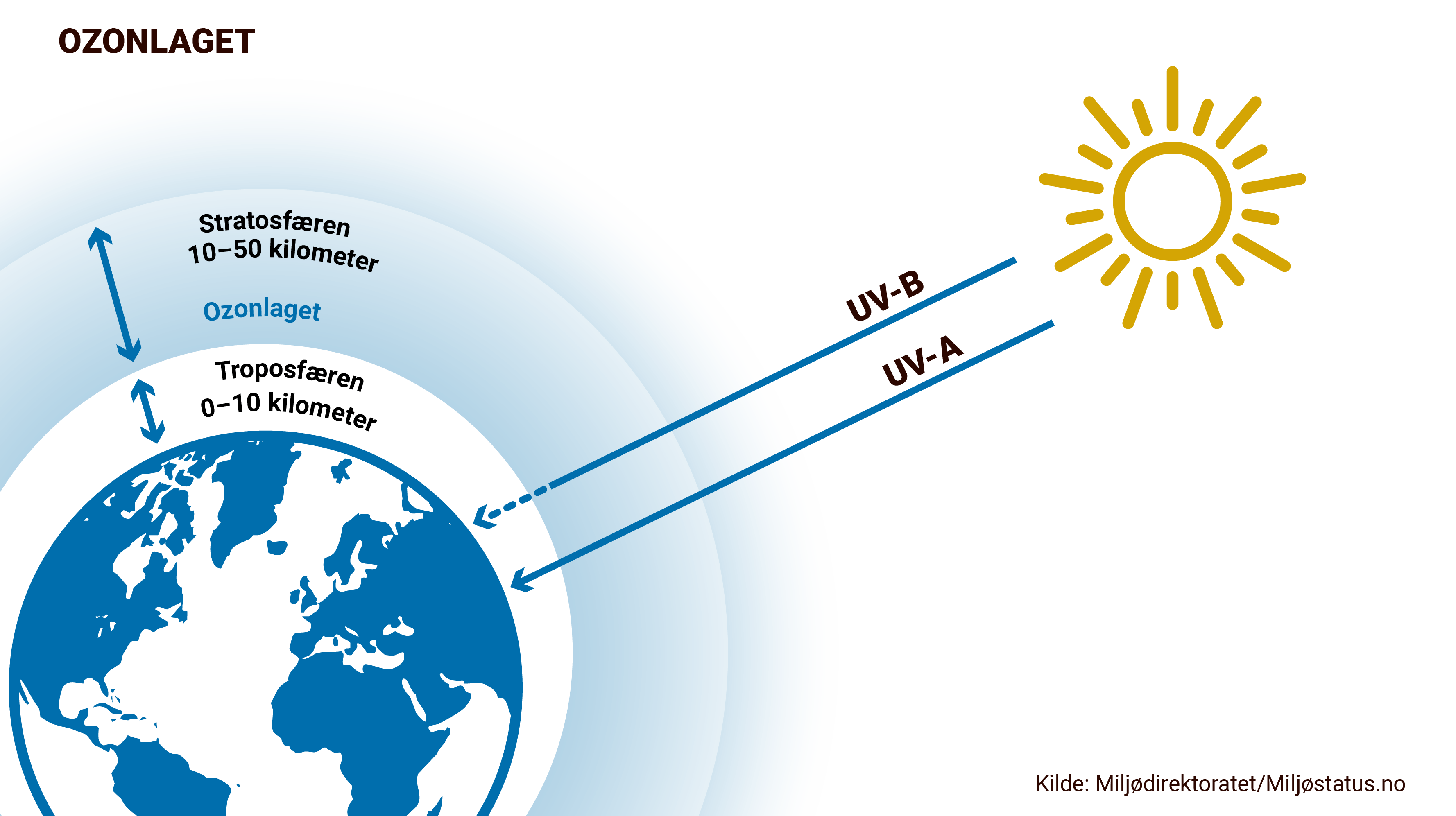 I kapittel 4.4 og figur 4.2 ser vi at de korteste bølgelengdene er fullstendig absorbert og spredt i atmosfæren, og aldri når bakken. De korteste bølgelengdene som solen emitterer absorberes høyere opp i atmosfæren, blant annet av oksygen som vi ser i reaksjonslikning 5.1 ovenfor. De korteste bølgelengdene som treffer jordoverflaten er stort sett UVA-stråler, takket være ozonet som dannes i stratosfæren (som vist i reaksjonslikning 5.2).