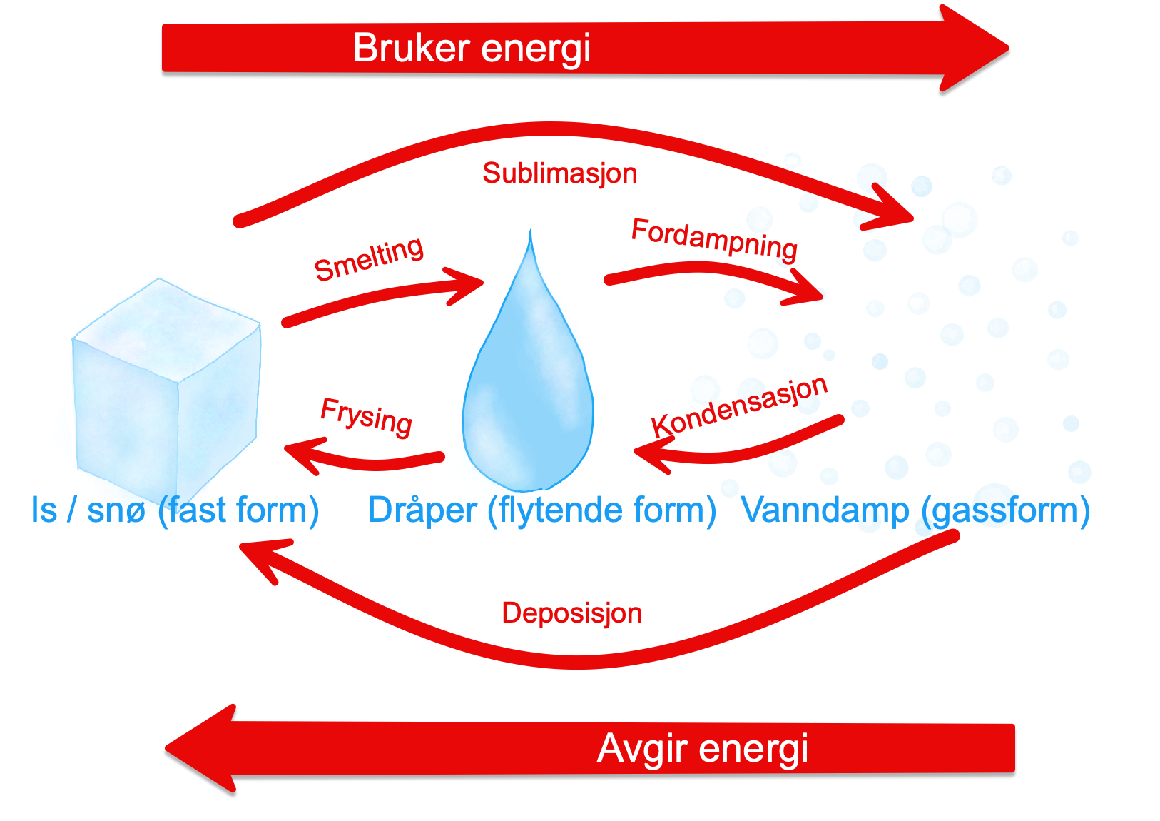 En ting som er ganske spesielt med vann i atmosfæren er at vi kan finne vann i alle fasetilstander i atmosfæren – gassform (vanndamp), flytende form (skydråper) og fast form (iskrystaller). Alle faseovergangene er også knyttet til energioverføringer, se figur 6.2. Det kreves energi å smelte vann fra fast form til dråper eller vanndamp, mens det frigjøres energi når vanndamp kondenserer til dråper eller iskrystaller. Energioverføringene ved faseoverganger gjør at temperaturen i vannet som kondenserer eller fordamper ikke endrer seg, all energioverføringen er knyttet til selve faseforandringen.