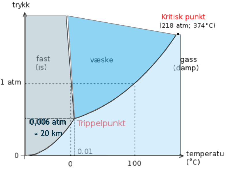 Figur 6.3: Trippelpunktet for vann viser den nøyaktige kombinasjonen av trykk (611 Pa) og temperatur (0,01 °C) der is, flytende vann og vanndamp kan eksistere samtidig i likevekt. Det kritiske punktet for vann markerer trykk og temperatur (22,06 MPa og 374 °C) der grensene mellom væske og gass forsvinner, og vann går over i en superkritisk fase. Husk at 1 atm = 1013 hPa = 101300 Pa