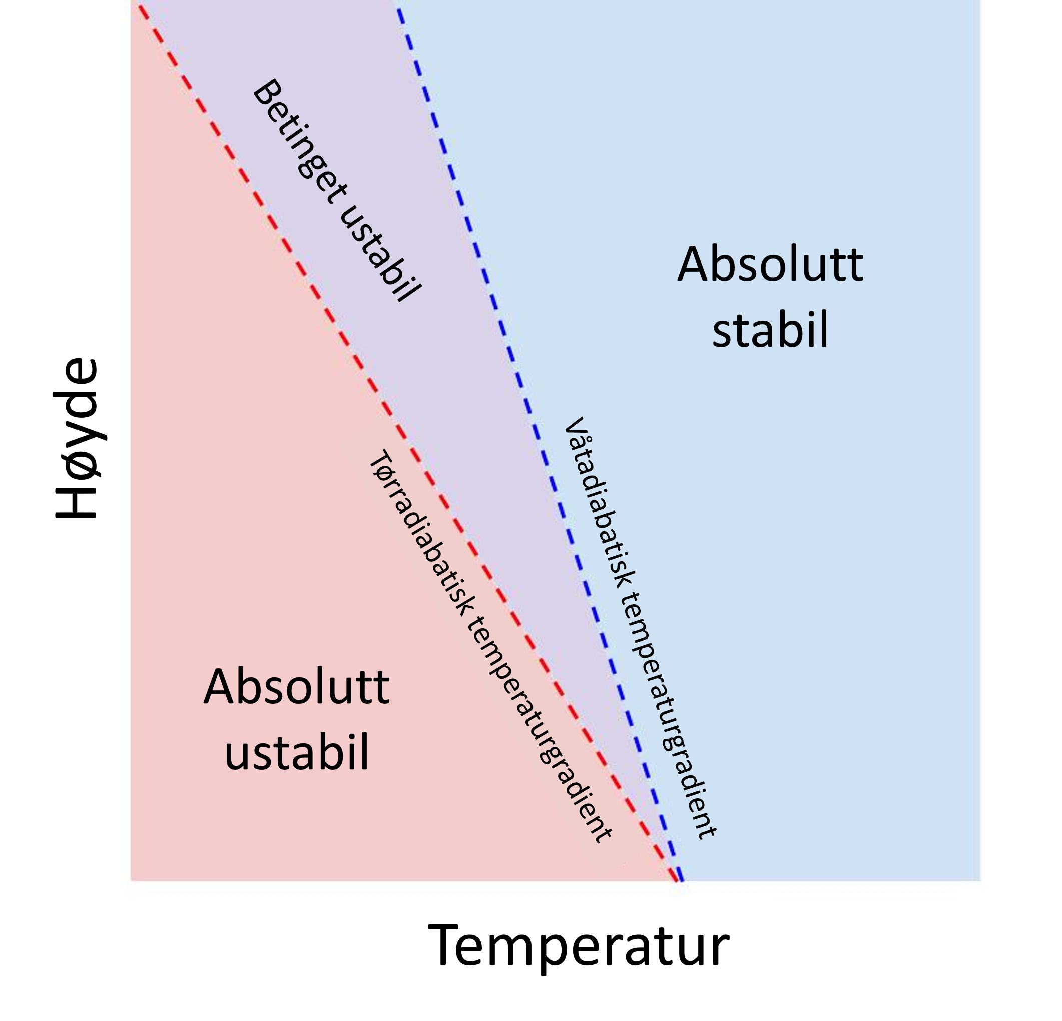 Atmosfærisk stabilitet beskriver luftens tendens til enten å bevege seg vertikalt eller å holde seg i ro. For å vurdere stabiliteten, sammenligner vi temperaturen til en stigende “pakke” med luft med temperaturen til den omkringliggende, stasjonære luften.