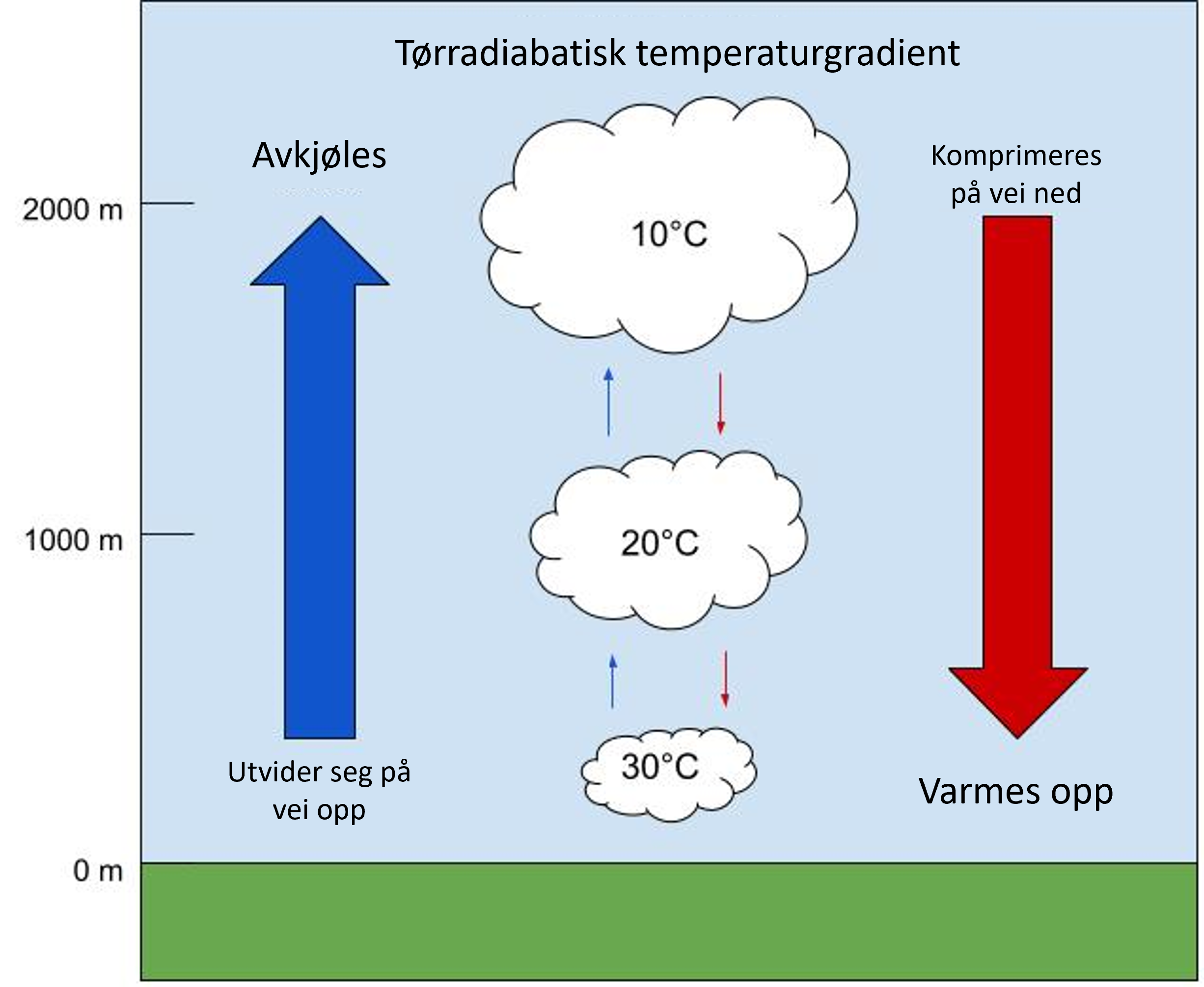 Når en luftpakke stiger, synker trykket rundt den. Pakken utvider seg, og dette arbeidet krever energi, som tas fra luftpakken selv. Resultatet er at luftpakken avkjøles uten å miste varme til omgivelsene. Dette kalles en adiabatisk prosess. Motsatt vil en synkende luftpakke bli komprimert av økende trykk og varmes opp adiabatisk.