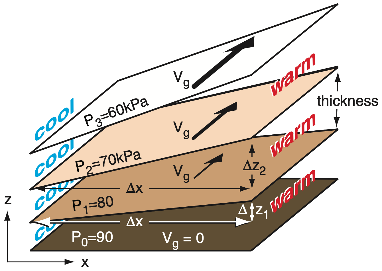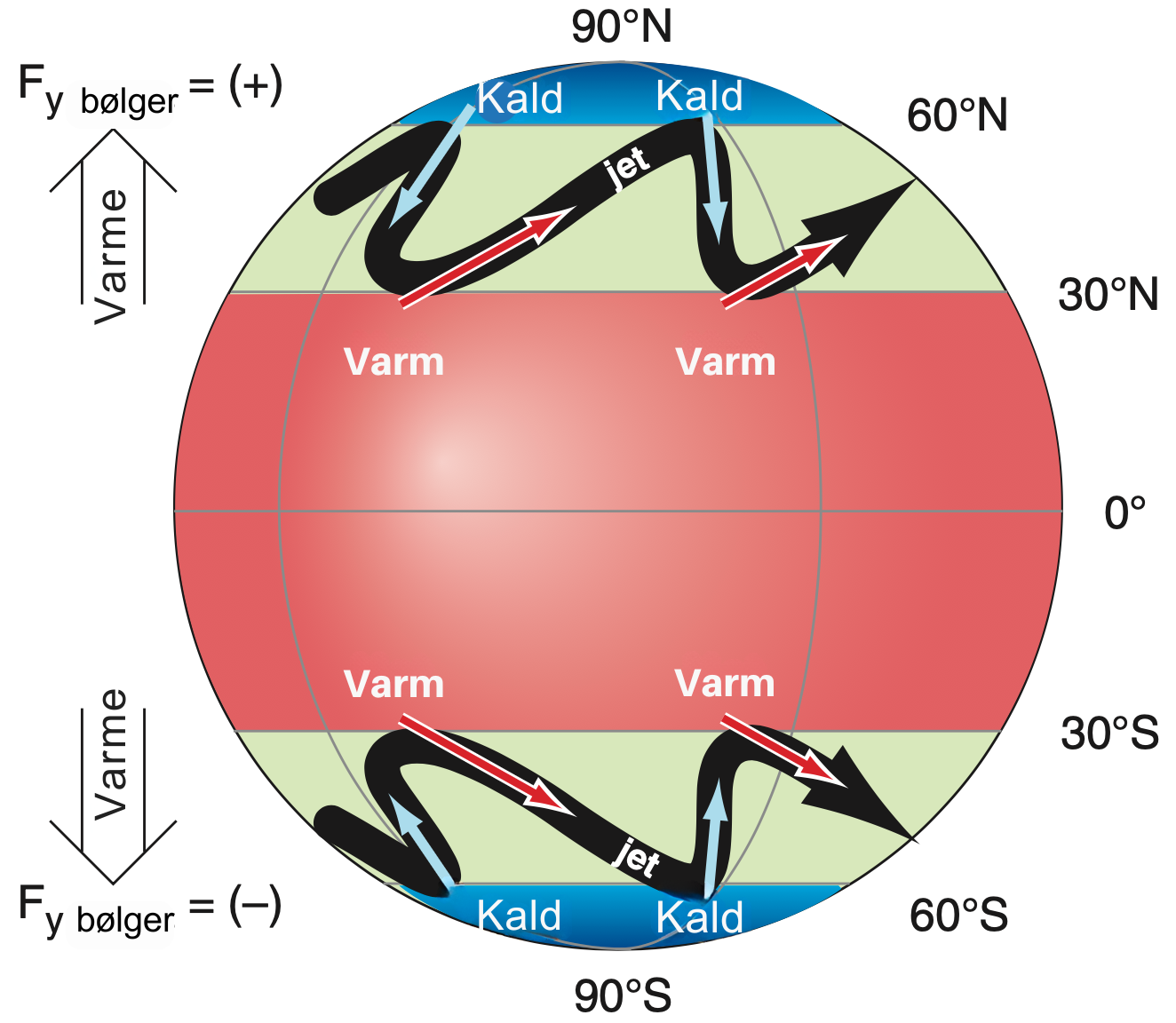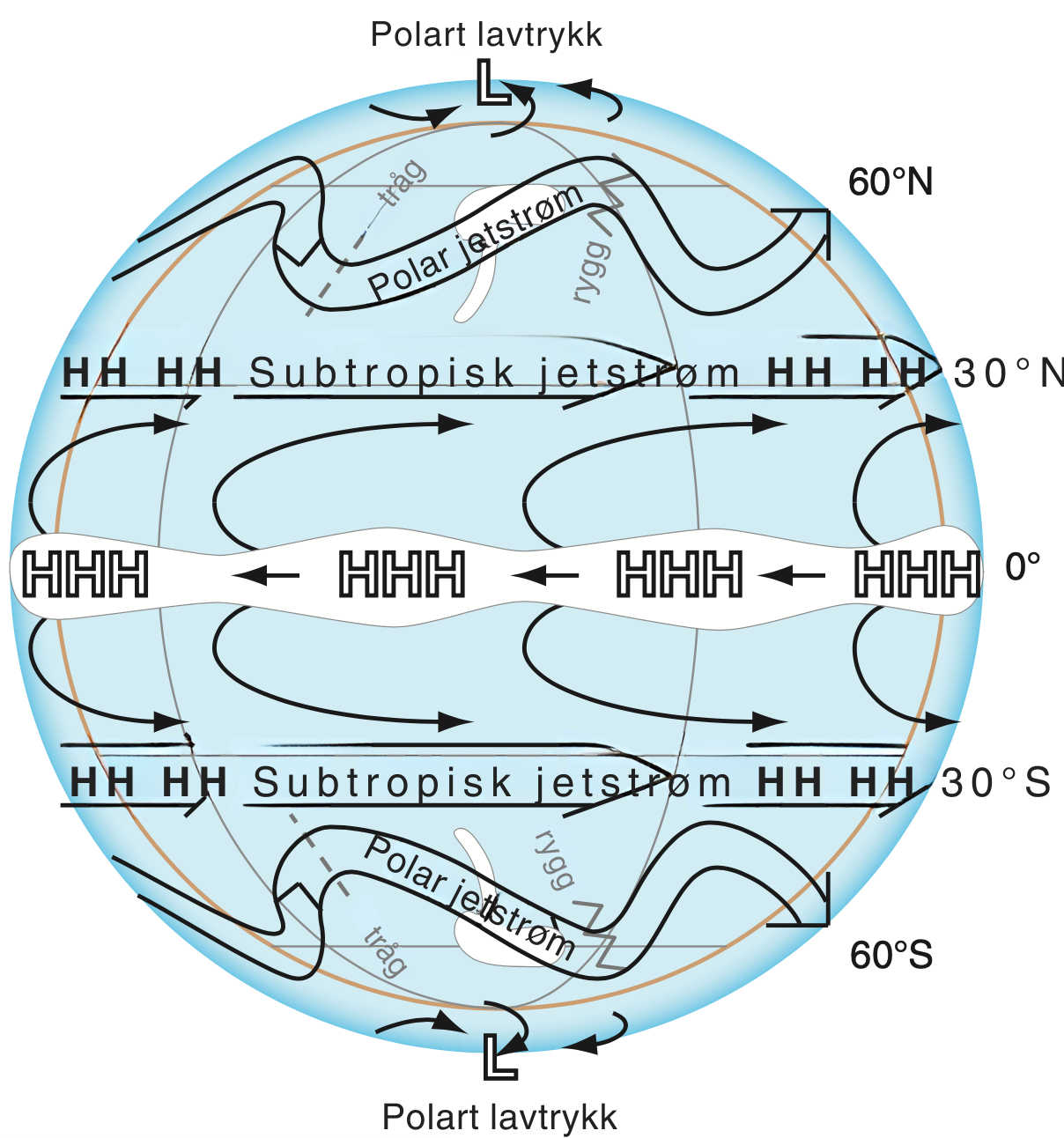 Når vi beveger oss fra ekvator mot polene, avtar solinnstrålingen gradvis. Dette gir store temperaturforskjeller mellom de varme områdene nær ekvator og de kalde områdene nær polene. Kald luft er tettere enn varm luft, og dette gjør at trykket i høyden avtar raskere over kalde områder enn over varme områder. Resultatet blir at det oppstår en horisontal trykkforskjell i høyden som ikke finnes ved bakkenivå.