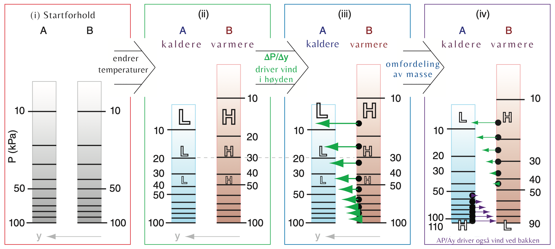 Figur 11.3 viser hvordan termisk sirkulasjon dannes. (i) Viser en startsituasjon med to steder som har lik temperatur og likt lufttrykk. (ii) viser at området til venstre er kjølt ned og området til høyre er varmet opp. Dette fører til at luften til venstre er mer komprimert, mens luften til høyre utvides. Dette fører til at vi før et høyere trykk i høyden på høyresiden enn på venstresiden. Det settes opp en trykkgradientkraft som setter i gang en bevegelse i høyden, som vises i (iii). Vi får da en masseforflytning mot venstre, som da påvirker trykkforholdene i de to kolonnene, og vi får en trykkforskjell også ved bakken, som da gir en bakkevind mot høyre (iv).