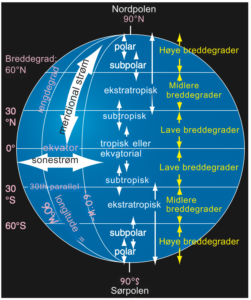 Når vi skal snakke om global sirkulasjon i atmosfæren, er det noen begreper som vi må ha på plass, se Figur 11.1.