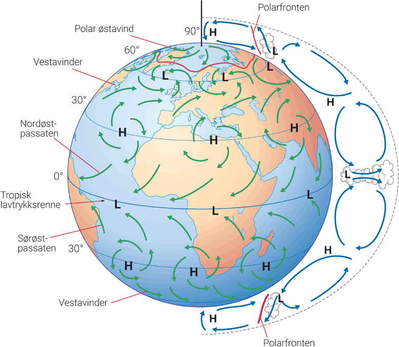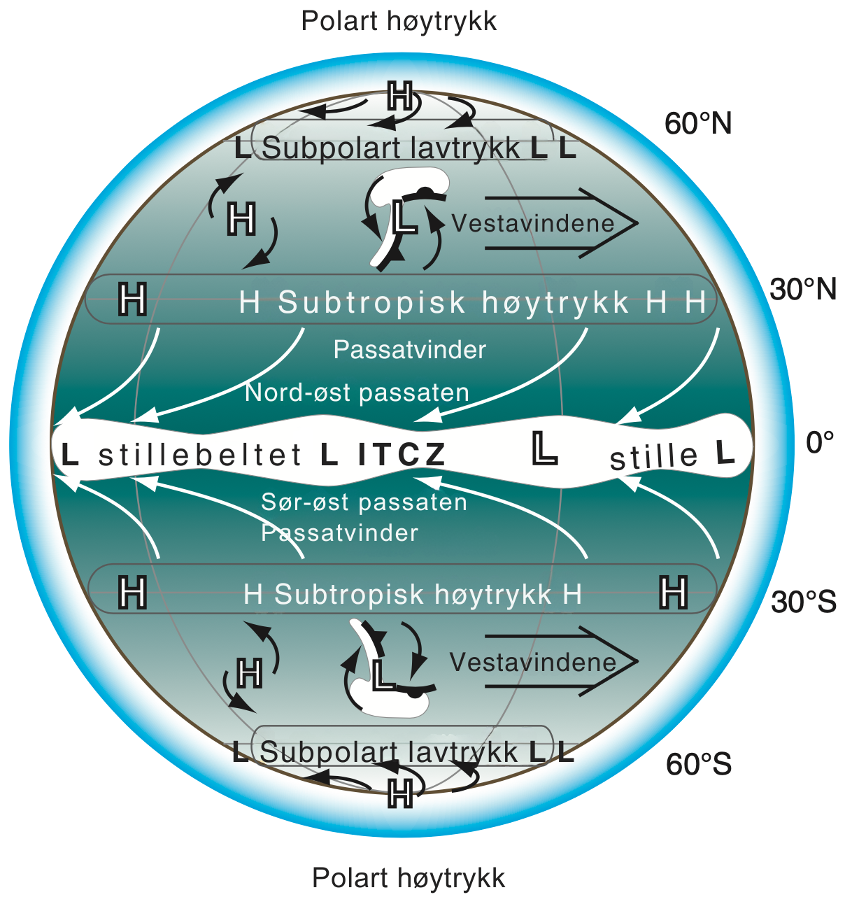 I forrige delkapittel så vi på hvordan atmosfæren sirkulerer i tre store celler på hver halvkule, drevet av temperaturforskjeller og jordrotasjonen. Denne sirkulasjonen skaper stabile høytrykks- og lavtrykksområder. Mellom disse trykkområdene oppstår det vedvarende vinder ved bakken. La oss se nærmere på disse globale vindsystemene.