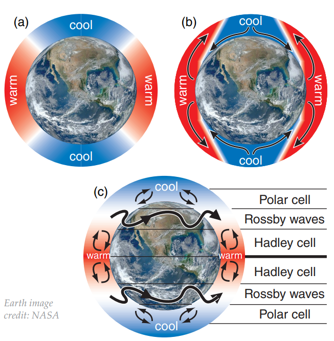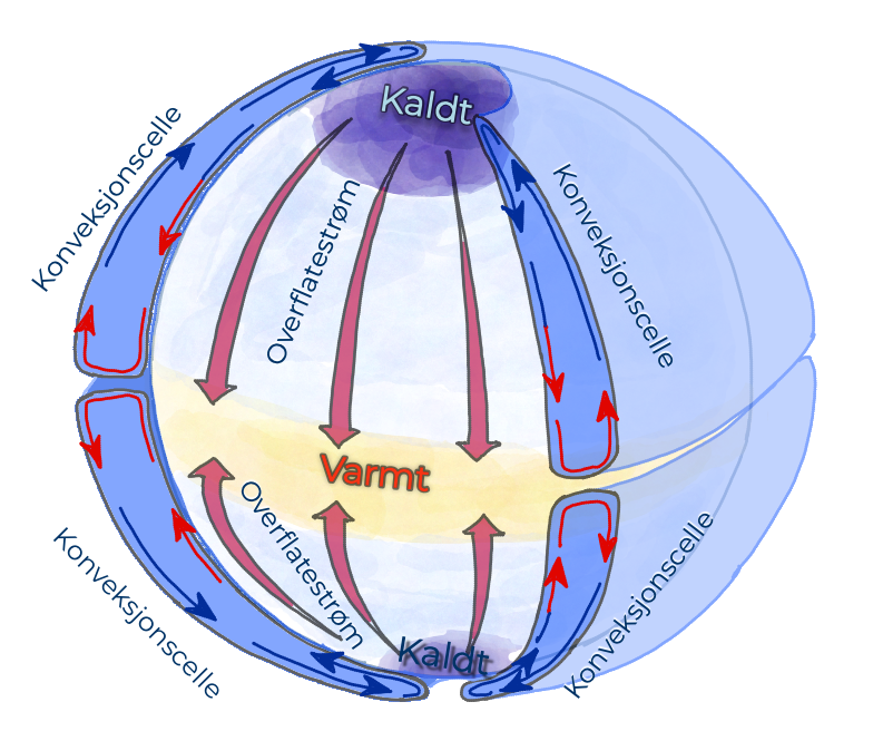 Strålingsoverskuddet skaper en oppvarming av luften ved bakken rundt ekvator, som gjør at denne stiger og endrer den retning og går nordover og sørover vekk fra ekvator. Vi får dermed en varmetransport i atmosfæren, som vi så på i Del 10.2. Dette ser vi i Figur 11.2b. I dette kapittelet skal vi se nærmere på de ulike vindsystemene som oppstår som følge av strålingsfordelingen.