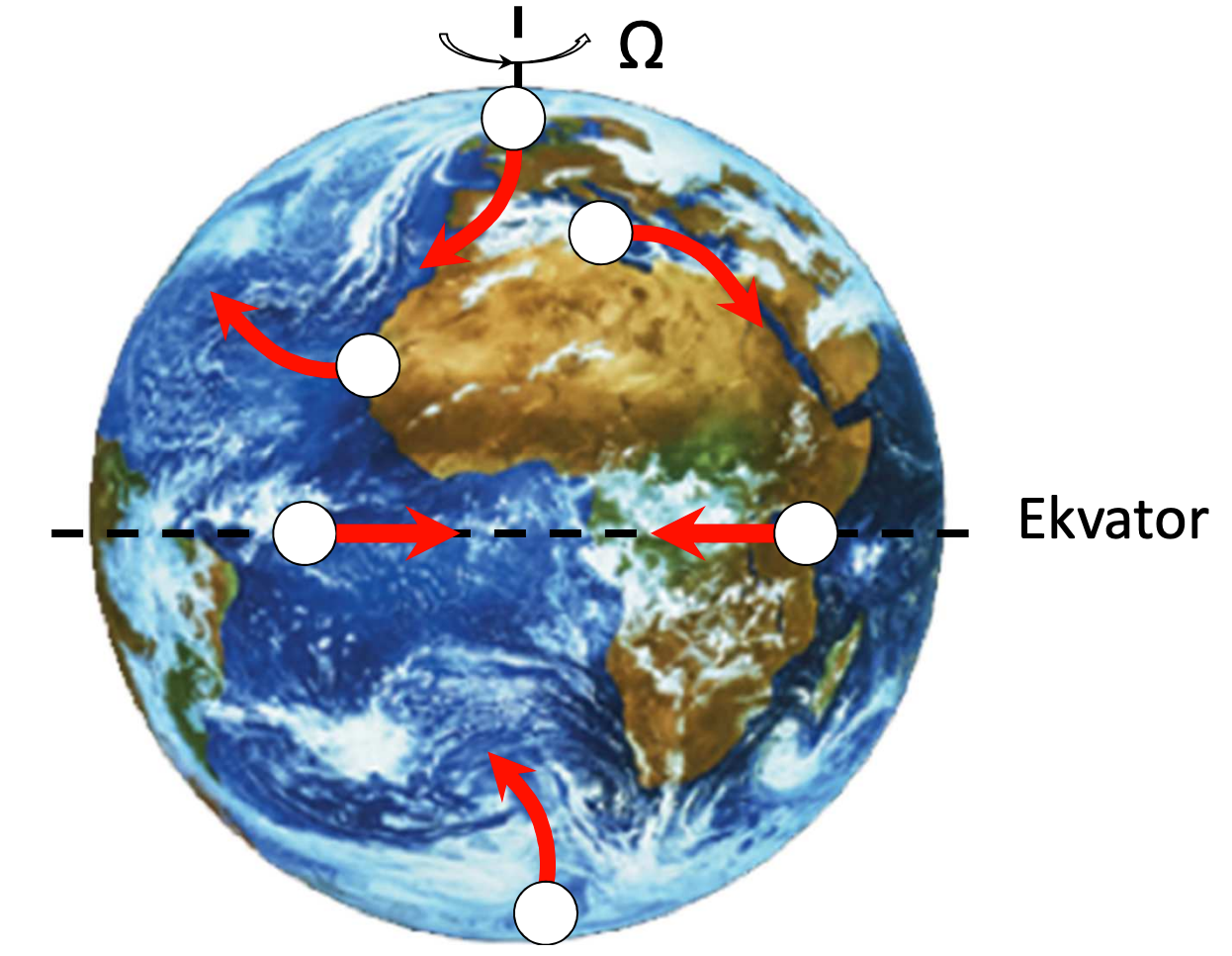 Situasjonen er derimot annerledes. Vi bor på en roterende klode, og jordrotasjonen har stor innvirkning på atmosfærens sirkulasjon. Vi så i kapittel 9.1.2 hvordan jordrotasjonen skaper en fiktiv kraft som kalles Corioliskraften. Corioliskraften påvirker vindretningen og skaper avbøyning av luftstrømmene. Vi skal nå gå litt mer i detalj på hvordan denne kraften virker, fordi det er så viktig for å forstå de globale sirkulasjonene i både atmosfæren og i havet, som vi kommer til i kapittel 15.