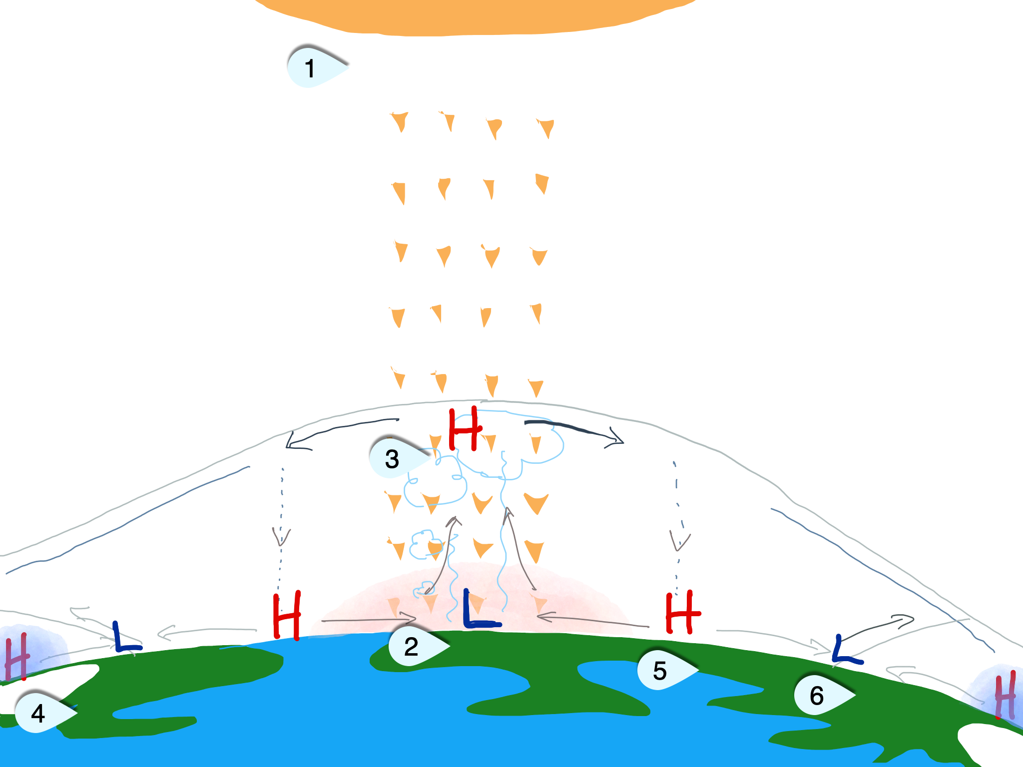 - Jordoverflaten absorberer stråling, som varmer opp jordoverflaten. Denne vil så varme opp luften over seg, som gjør at denne luften blir lettere enn luften rundt, på samme måten som i Del 11.1.2. Luften stiger til den møter tropopausen.