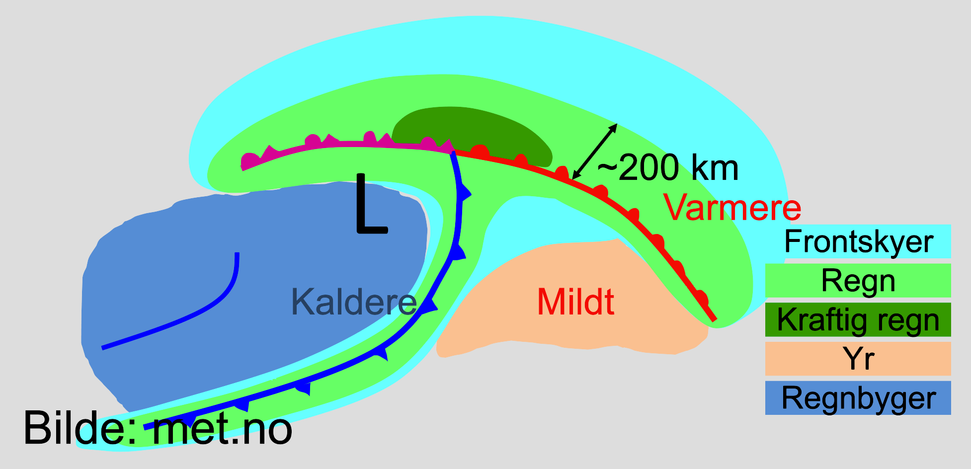 | Nedbør | Sammenhengende nedbør. Gjerne mange timer. Lett til moderat regn, snø, sludd, eller yr | Yr | Normalt sett ingen nedbør, noen ganger lettere nedbør eller byger |