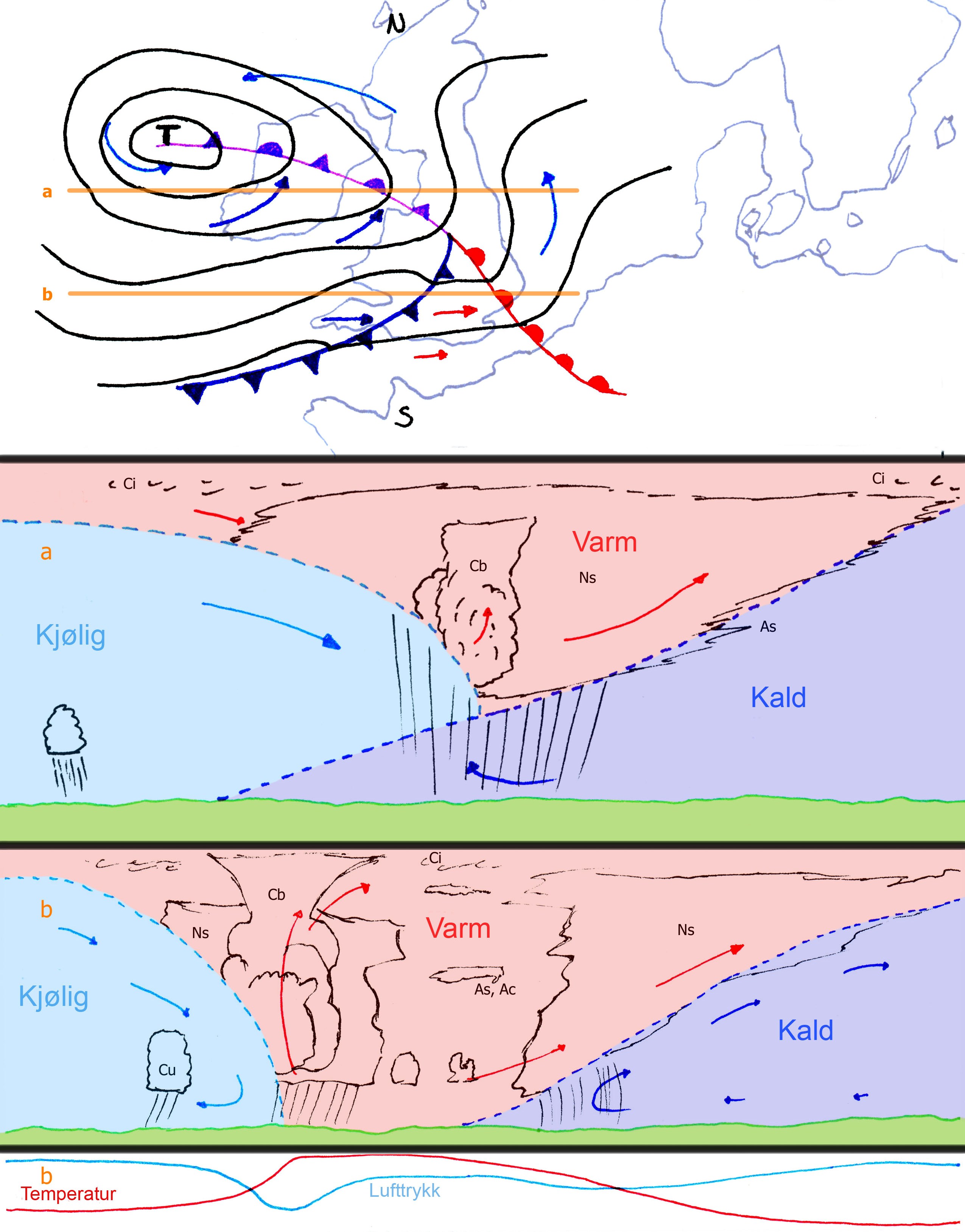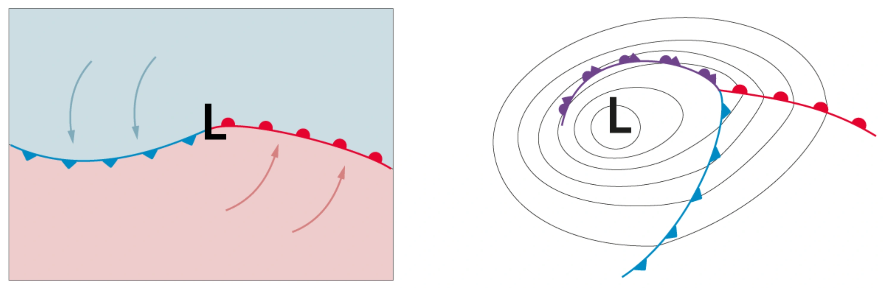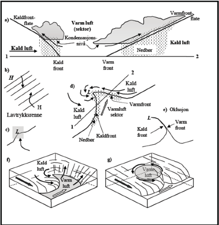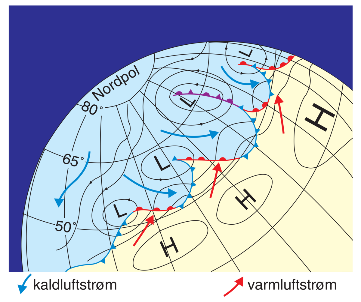 Når polarfronten bølger seg, kan det dannes både varmfronter og kaldfronter, se figur 12.8. En varmfront oppstår der varm luft glir nordover over kald luft, mens en kaldfront dannes der kald luft presser seg sørover under den varmere luften. Disse frontene er sentrale i utviklingen av ekstratropiske lavtrykk, og de gir typiske værforandringer: varmfronten gir ofte langvarig, jevn nedbør, mens kaldfronten gir kraftigere, men kortere regnbyger og klarere luft etter passering.