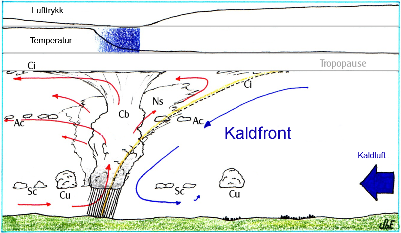 En kaldfront oppstår der kald luft gjør et fremstøt og skyver varmere luft foran seg til værs.