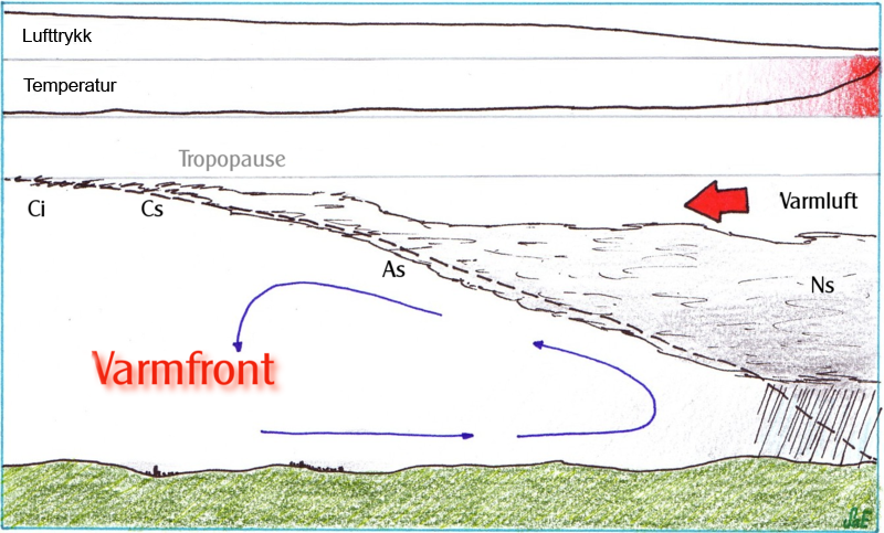 Vær: Været utvikler seg gradvis. De første tegnene er høye fjærskyer (Cirrus), som etterfølges av slørskyer (Cirrostratus) og deretter lagskyer (Altostratus). Til slutt kommer de tykke nedbørsskyene (Nimbostratus), som gir langvarig, jevn nedbør. Vinden øker på, og lufttrykket faller. Etter at fronten har passert, blir været mildere og fuktigere, og nedbøren letter.