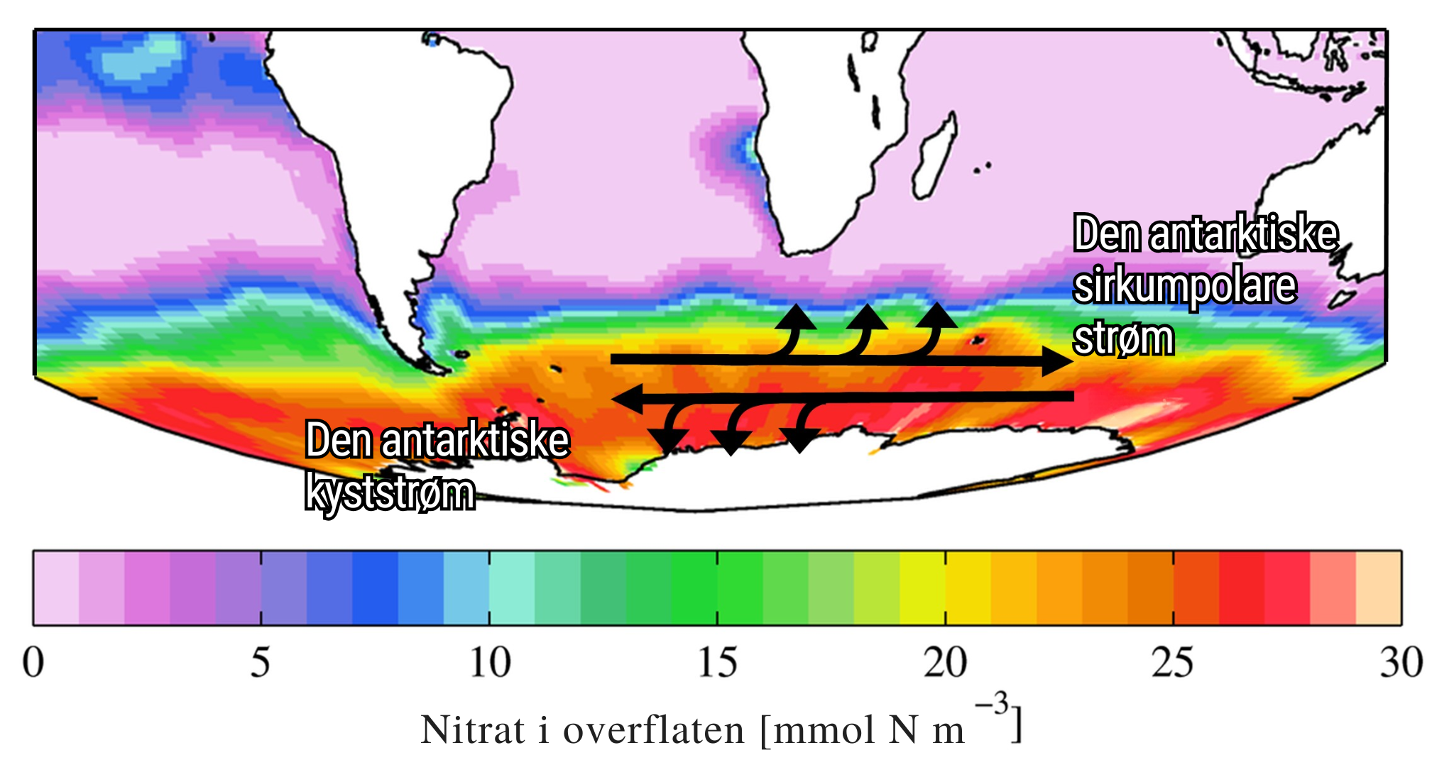 Rundt Antarktis: Dypvannsstrømmene blir med i den kraftige Antarktiske sirkumpolare strømmen før de forgrener seg inn i Indiahavet og Stillehavet.