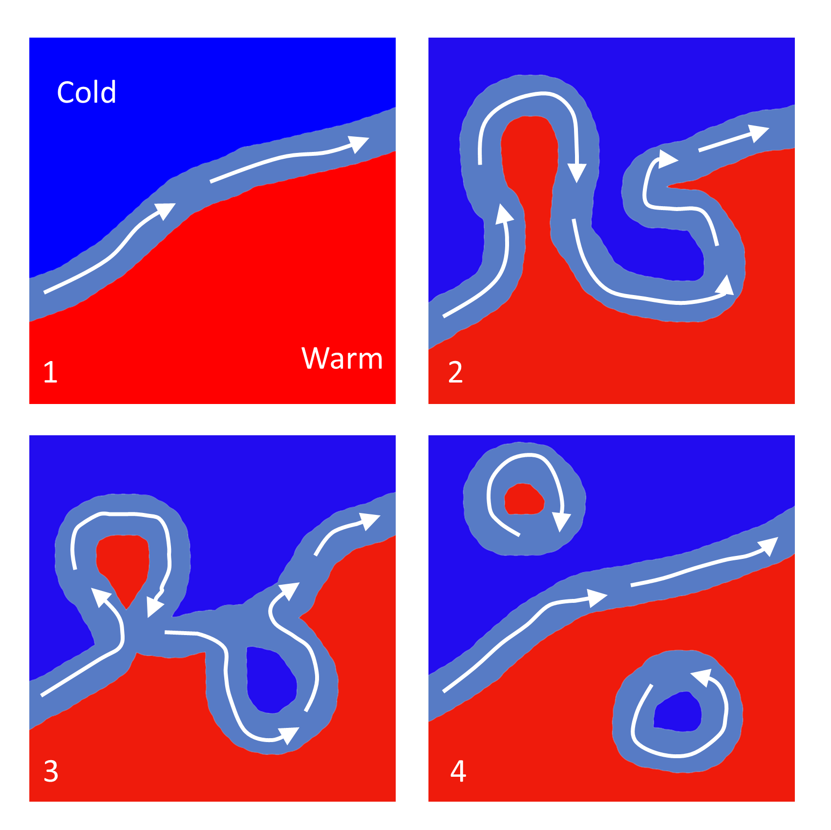 Golfstrømmen er spesielt dynamisk og danner ofte store slynger (meandere). Noen ganger kan disse slyngene snøre seg av og danne selvstendige, roterende virvler. En ring med kald kjerne dannes når en slynge mot sør fanger kaldt vann fra kysten, mens en ring med varm kjerne dannes når en slynge mot nord fanger varmt vann fra Sargassohavet.