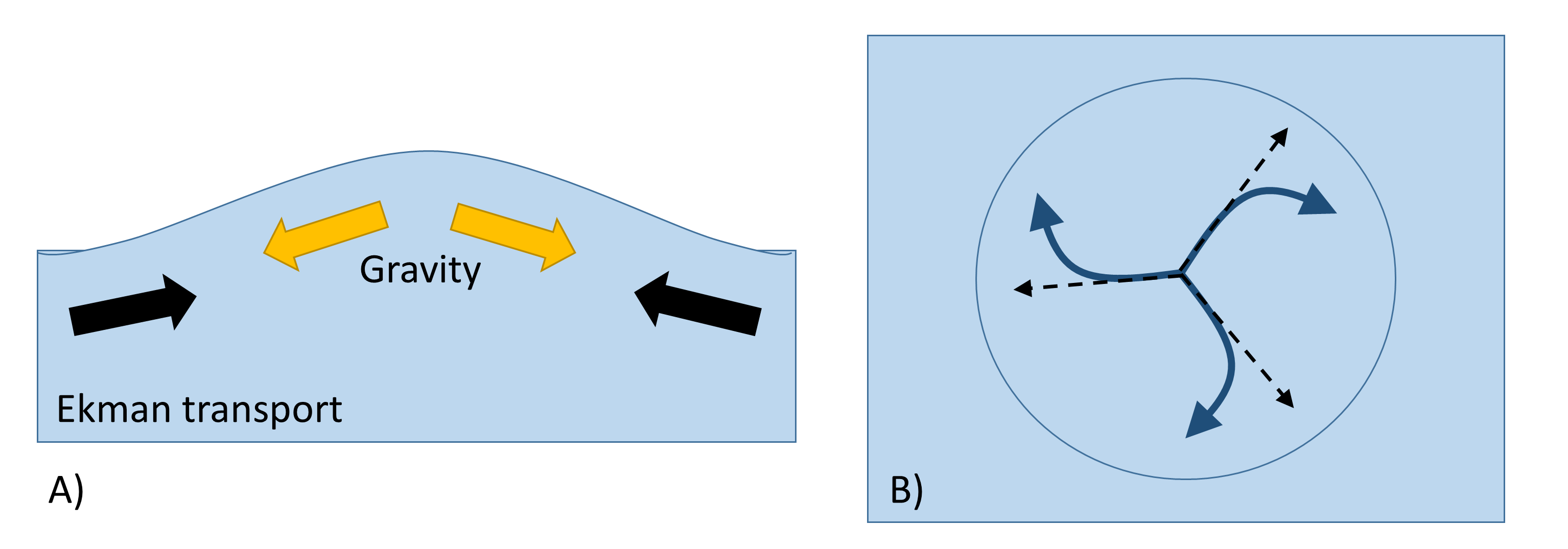 Inne i en gyre fører Ekmantransport til at vann “stables opp” i sentrum, og havnivået kan være opptil en meter høyere her enn ved kantene. Tyngdekraften vil forsøke å trekke dette vannet utover og nedover, mens corioliseffekten trekker det innover igjen. Når disse to kreftene – trykkgradientkraften (fra tyngdekraften) og corioliseffekten – er i balanse, oppstår en geostrofisk strøm. Denne strømmen renner parallelt med “haugens” konturer og er det som opprettholder den sirkulære bevegelsen i gyren, selv i perioder med lite vind.