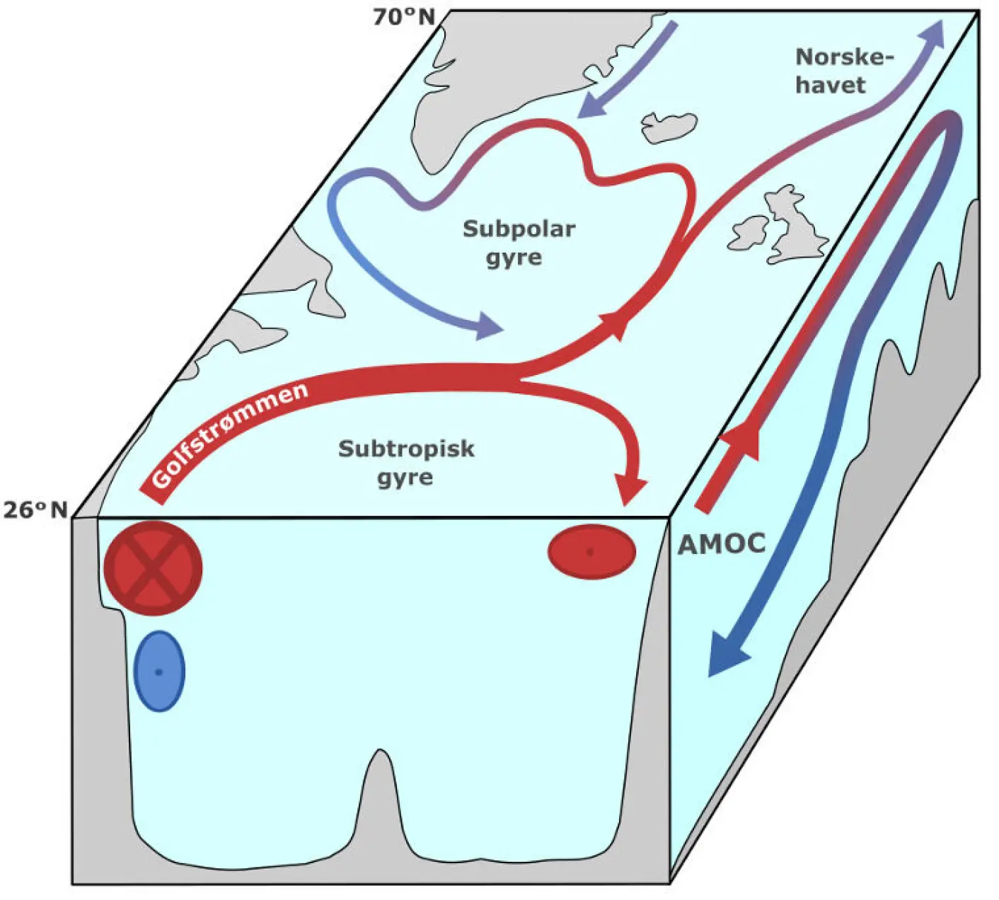 Den delen av den termohaline sirkulasjonen som foregår i Atlanterhavet, kalles AMOC (Atlantic Meridional Overturning Circulation). Dette systemet er avgjørende for klimaet i Nord-Europa og er i praksis vår “sentralvarme”. AMOC består av to hovedgrener: