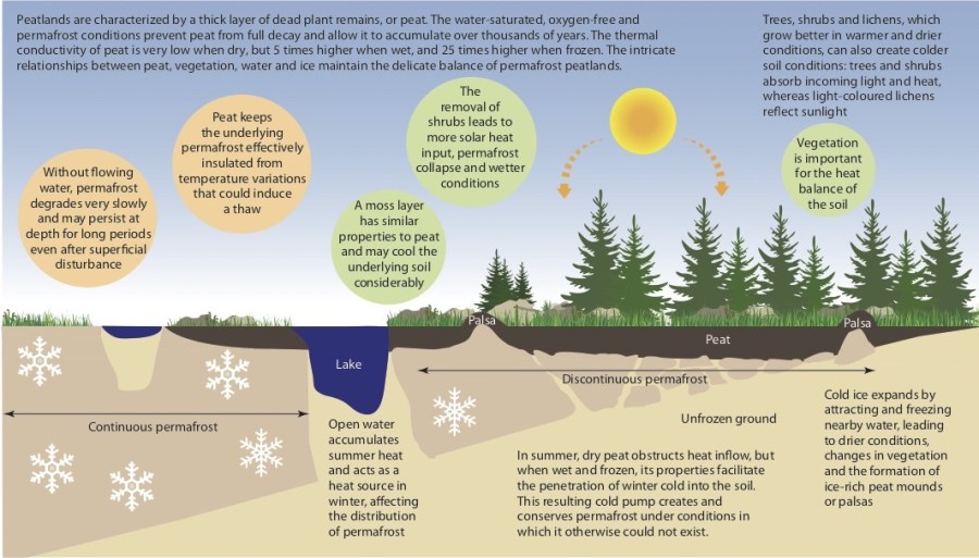 Vegetasjonen påvirker både energiutvekslingen mellom atmosfæren og bakken og vannbalansen i systemet. Tett vegetasjon kan redusere solinnstrålingen til bakken og dermed bidra til kaldere forhold. Samtidig påvirker planterøtter vanninnholdet i jorden, som igjen har betydning for fryse- og tineprosessene. Mose og lav er særlig viktige da de danner et isolerende lag som beskytter permafrosten.