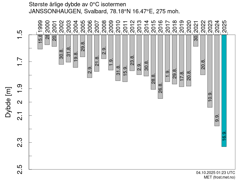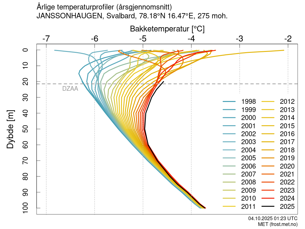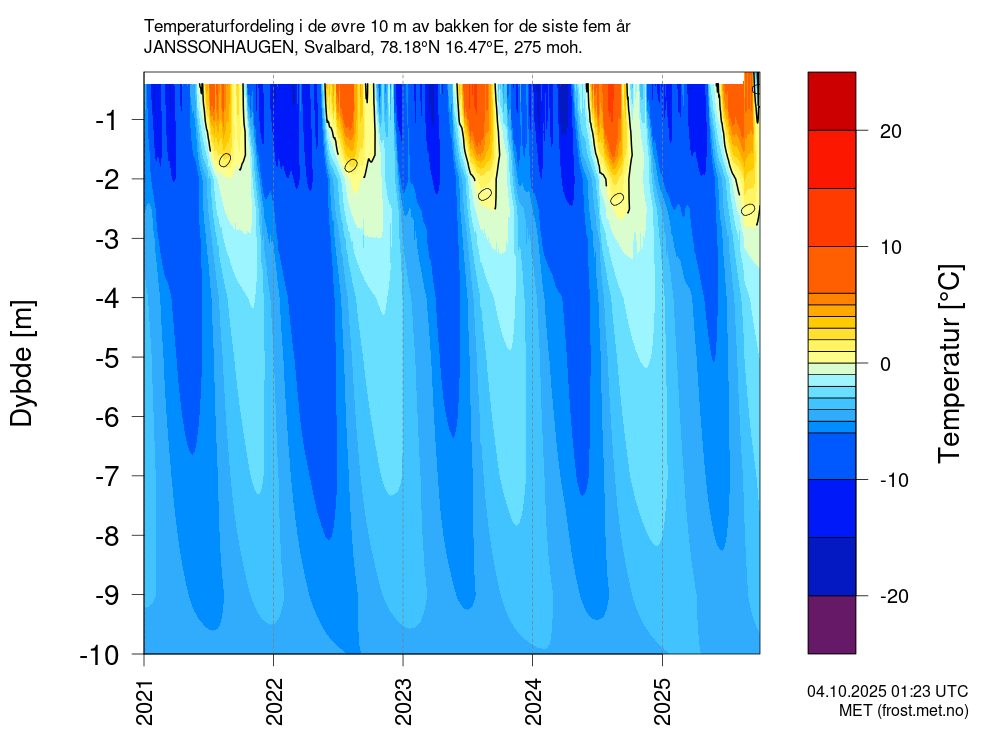 Temperaturprofil og dybdevariasjon I permafrostens øvre lag observerer vi en markant sesongvariasjon i temperaturen. Det aktive laget, som typisk strekker seg fra 0,5 til 2 meter under overflaten, gjennomgår årlige sykluser av frysing og tining. Denne dynamikken skaper en karakteristisk temperaturprofil hvor amplituden i temperatursvingningene gradvis avtar med dybden. Ved en viss dybde, kjent som “ingen årlig variasjon”-dybden, blir de årlige temperaturvariasjonene så små at de knapt er målbare (mindre enn 0,1°C).