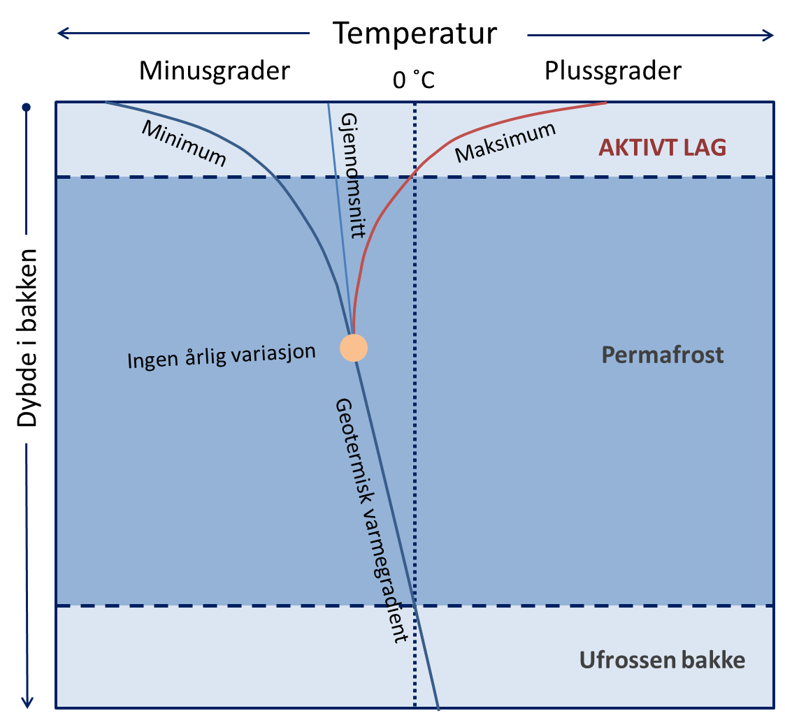 Permafrost defineres som grunn eller bakke som holder en temperatur på 0°C eller lavere i minst to påfølgende år. Dette omfatter både jord, sedimenter og berggrunn, uavhengig av fuktighetsinnhold eller isinnhold. Over permafrosten finner vi det aktive laget, som tiner om sommeren og fryser igjen om vinteren.