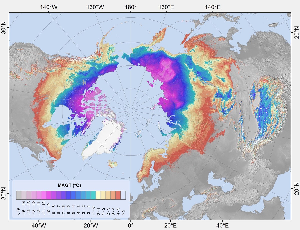 Permafrost dekker omkring 15% av landjorden på den nordlige halvkule, inkludert store deler av: