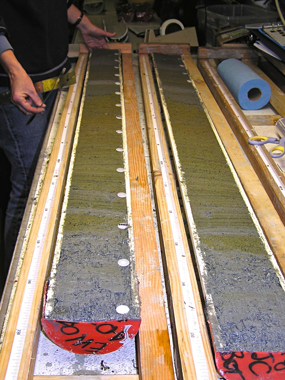 En forsker som jobber i en grotte. Kilde: Bcerrato1 på Wikimedia Commons CC BY-SA 4.0 Havbunns- og innsjøsedimentkjerner: På bunnen av hav og innsjøer avsettes det kontinuerlig partikler som synker ned, lag på lag. Disse sedimentene inneholder rester av pollen, plankton og andre organismer. Ved å bore ut kjerner av disse sedimentene kan forskere analysere innholdet. For eksempel kan typen pollen fortelle hvilke planter som vokste i området, noe som indikerer klimaet på land. Skall fra små marine organismer (foraminiferer) i havbunnssedimenter kan analyseres for å avdekke fortidens havtemperatur.