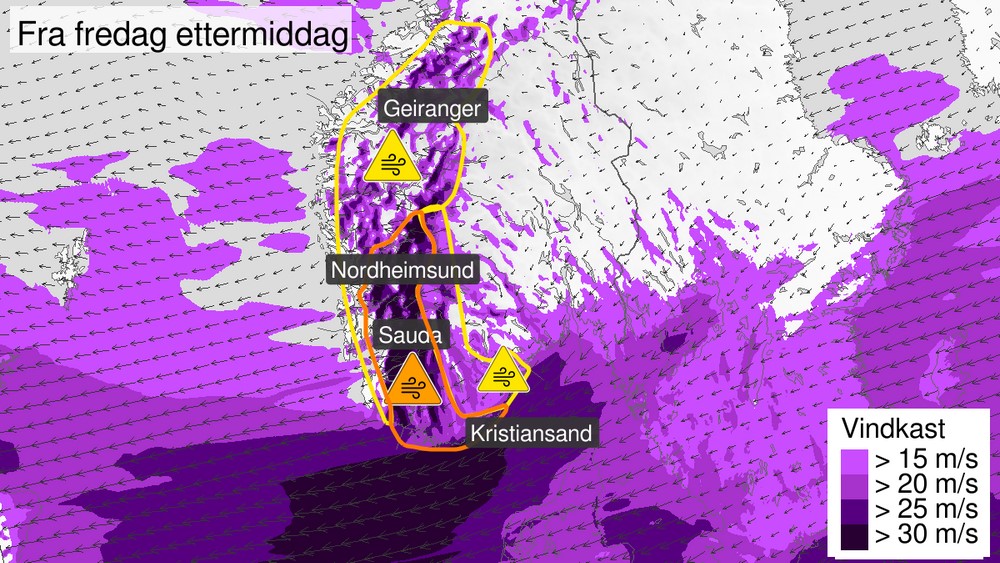 Det er like stor sannsynlighet for kraftig nedbør alle disse tre stedene.