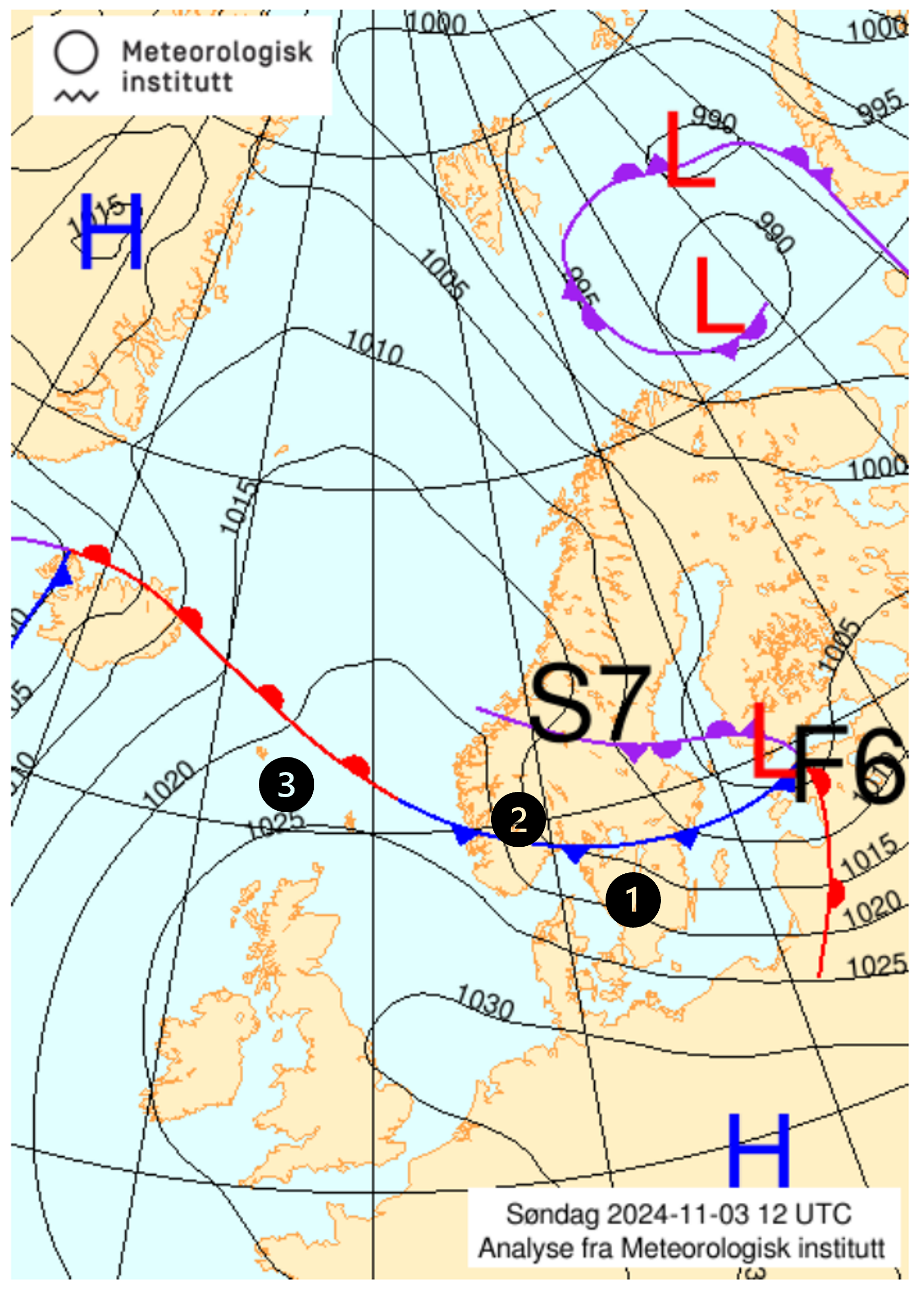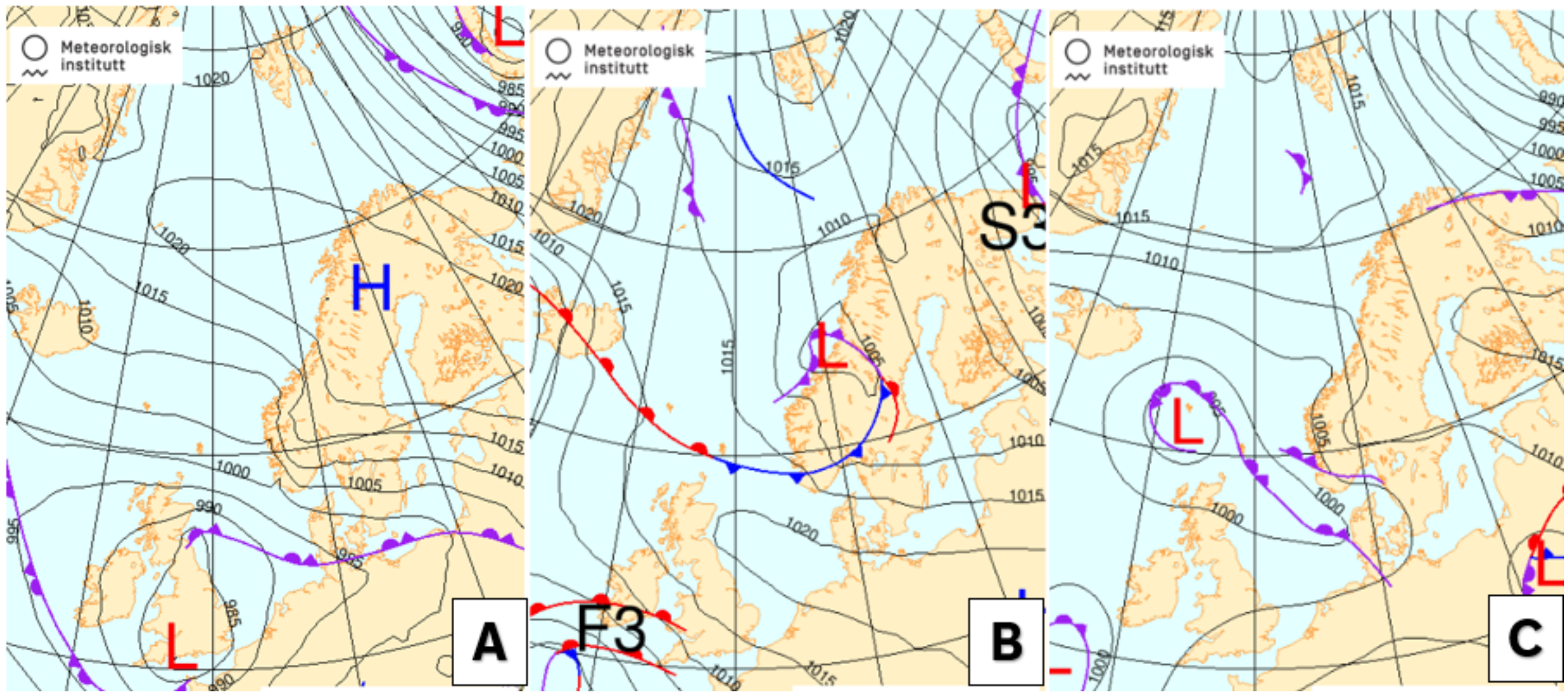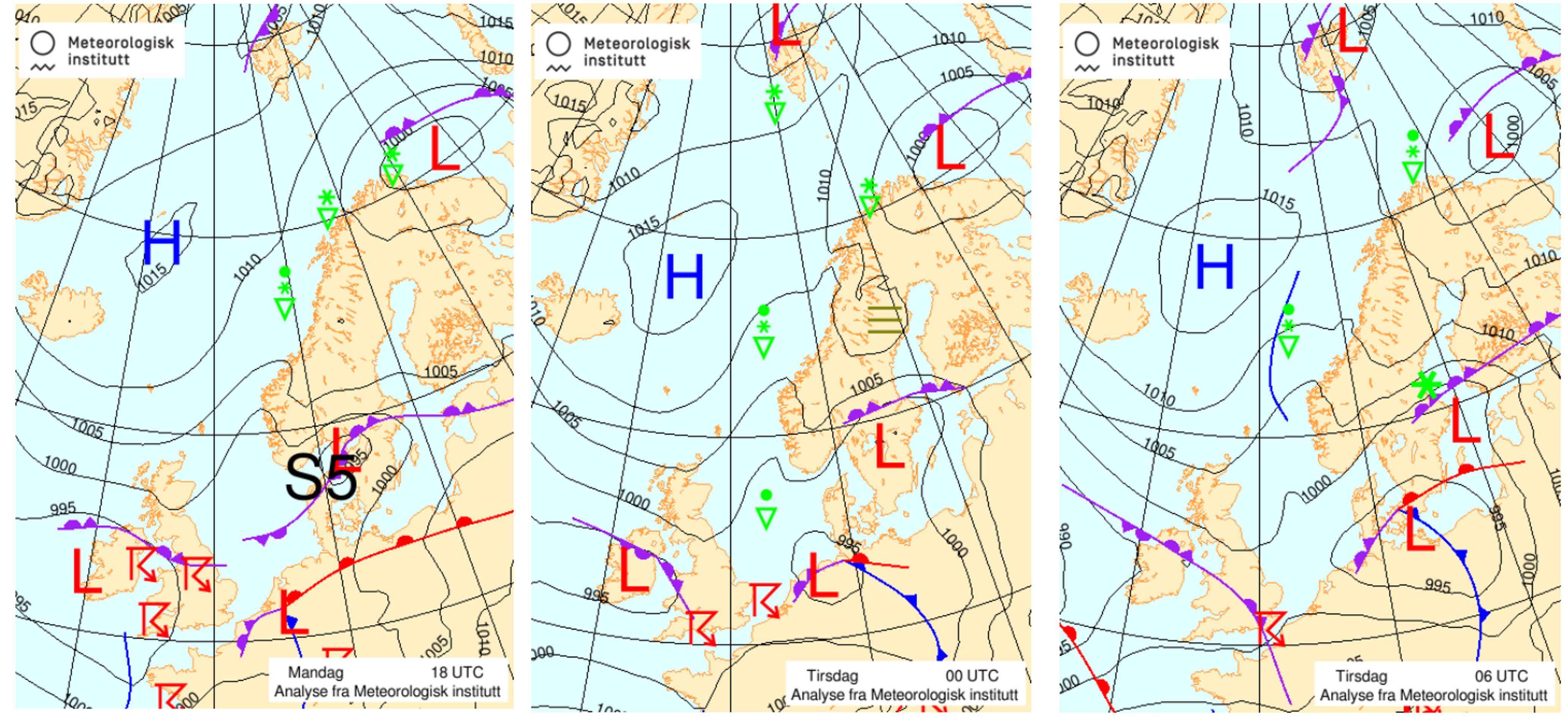 Her er frå venstre analysekart frå måndag klokka 18.00, analysekart frå midnatt natt til tysdag og analysekart frå tysdag klokka 06.00: