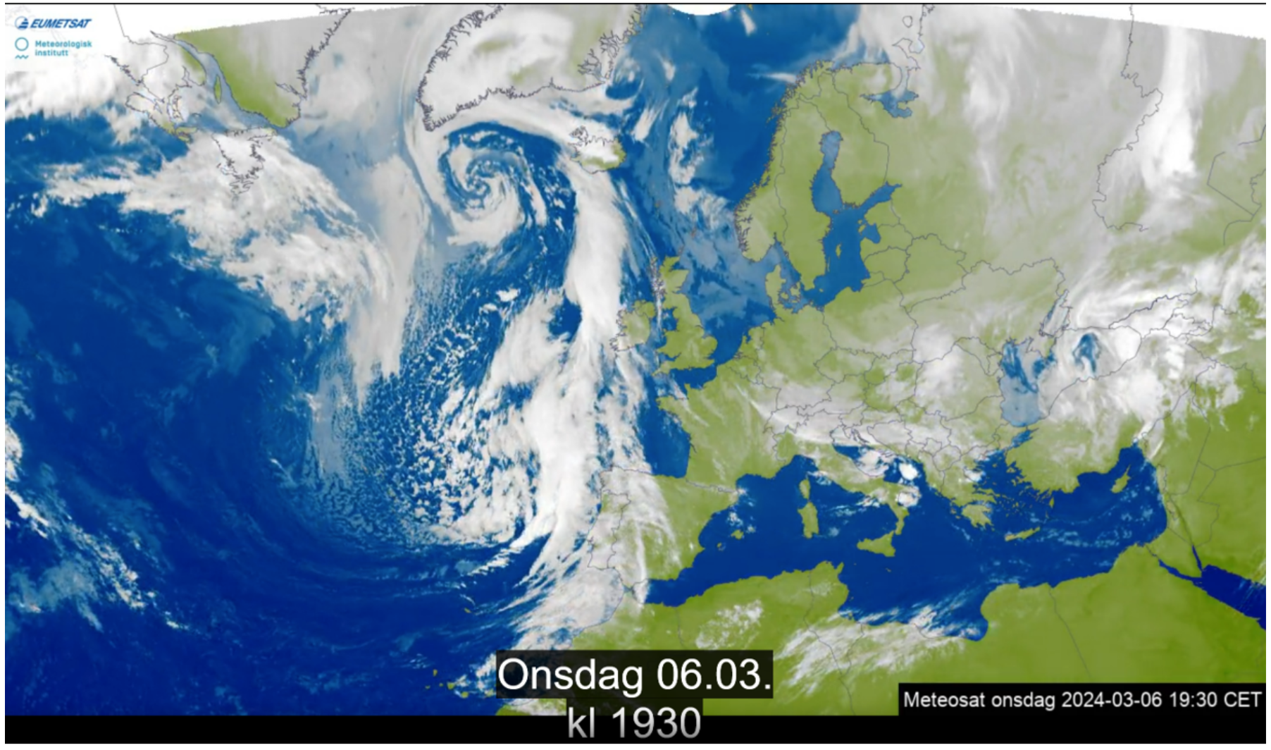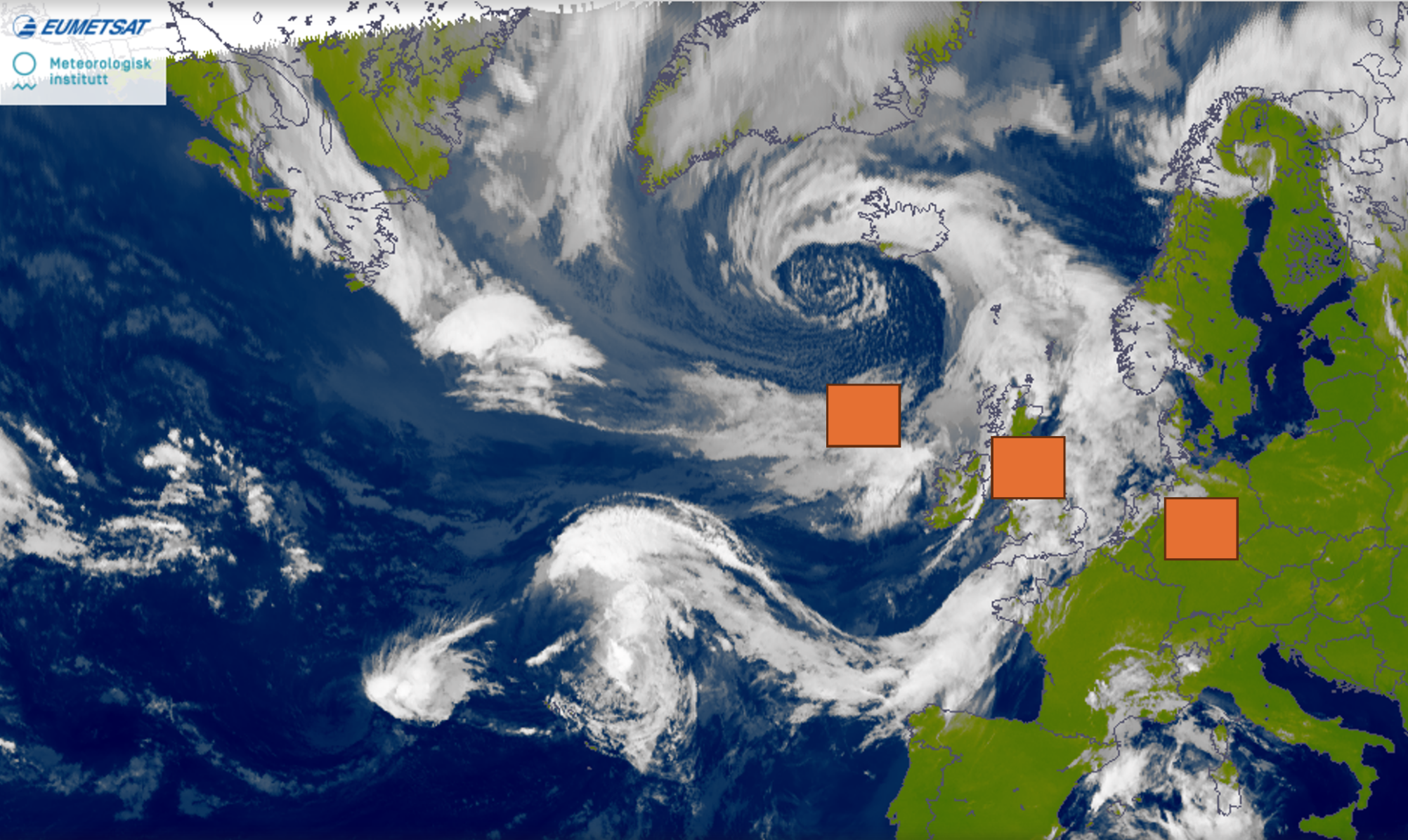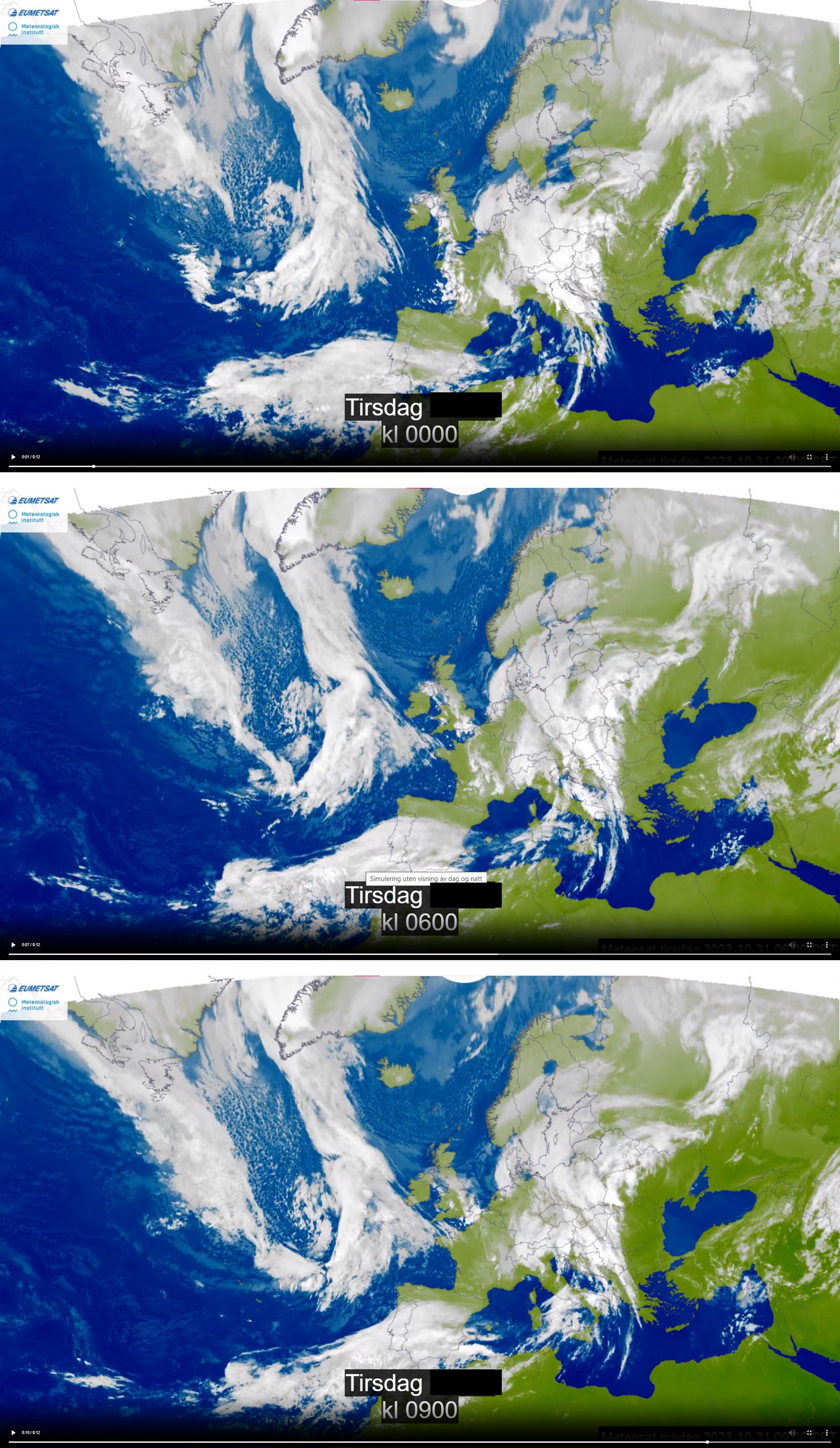 I denne fanen finn du tre skjermbilete tekne av ein animasjon av satellittbilete, det betyr at “spel av”-knappen i biletet ikkje er aktiv. Det øvste biletet er frå midnatt natt til tysdag, det midtarste er frå tysdag klokka 06.00 og det nedste tysdag klokka 09.00: