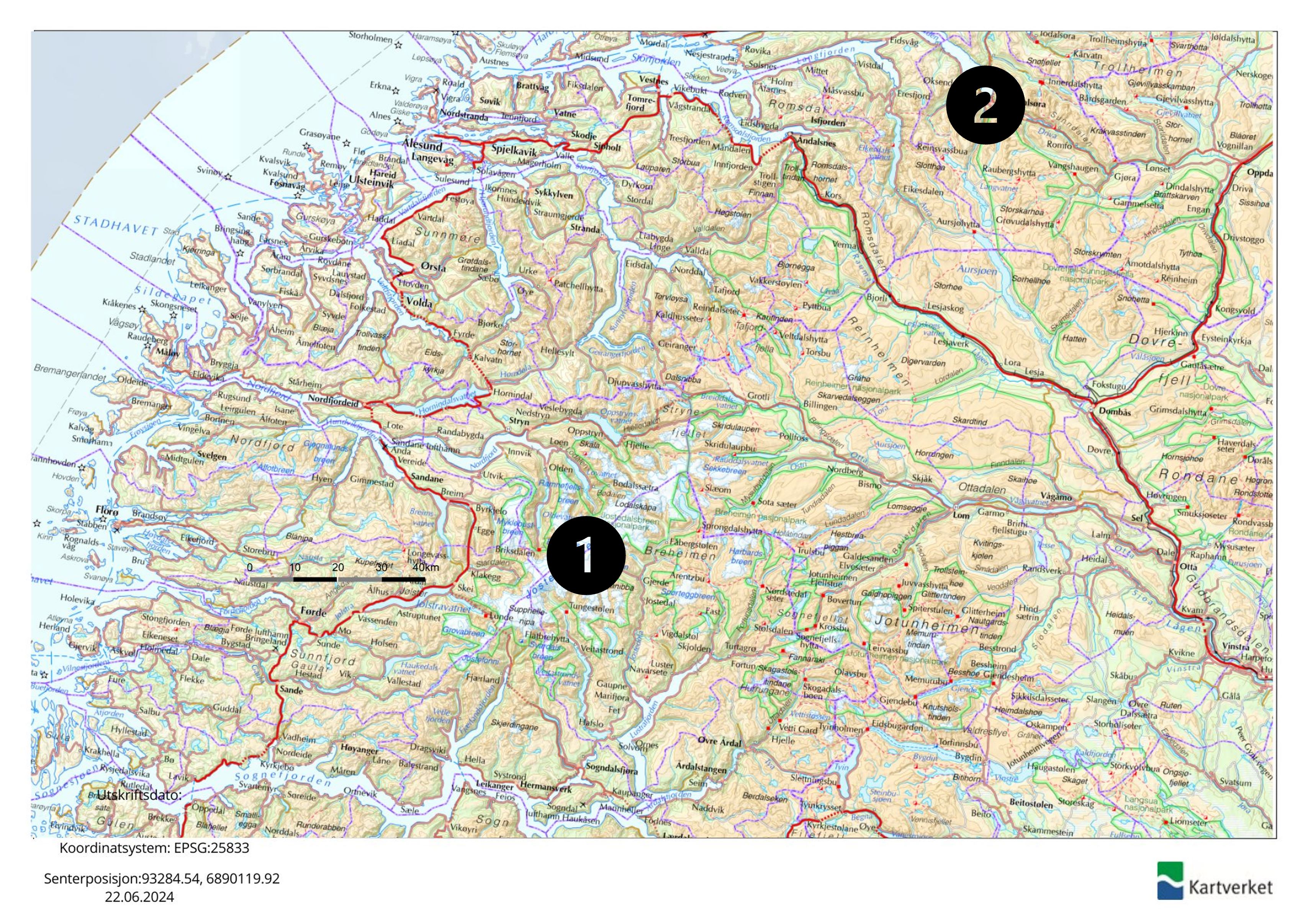 Det er størst sannsynlighet for kraftig nedbør på stedet merket med 1.
