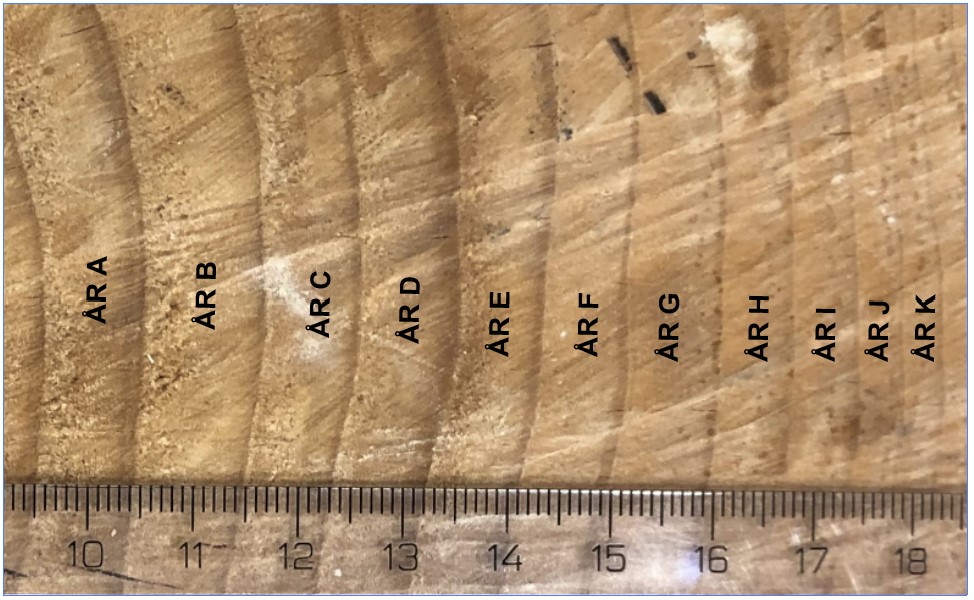 Bildet nedenfor viser et utsnitt av en trestamme med årringer. Årringene er merket med bokstavene A–K, som representerer hvert sitt år. Nederst i bildet ligger det en linjal med centimetermål.