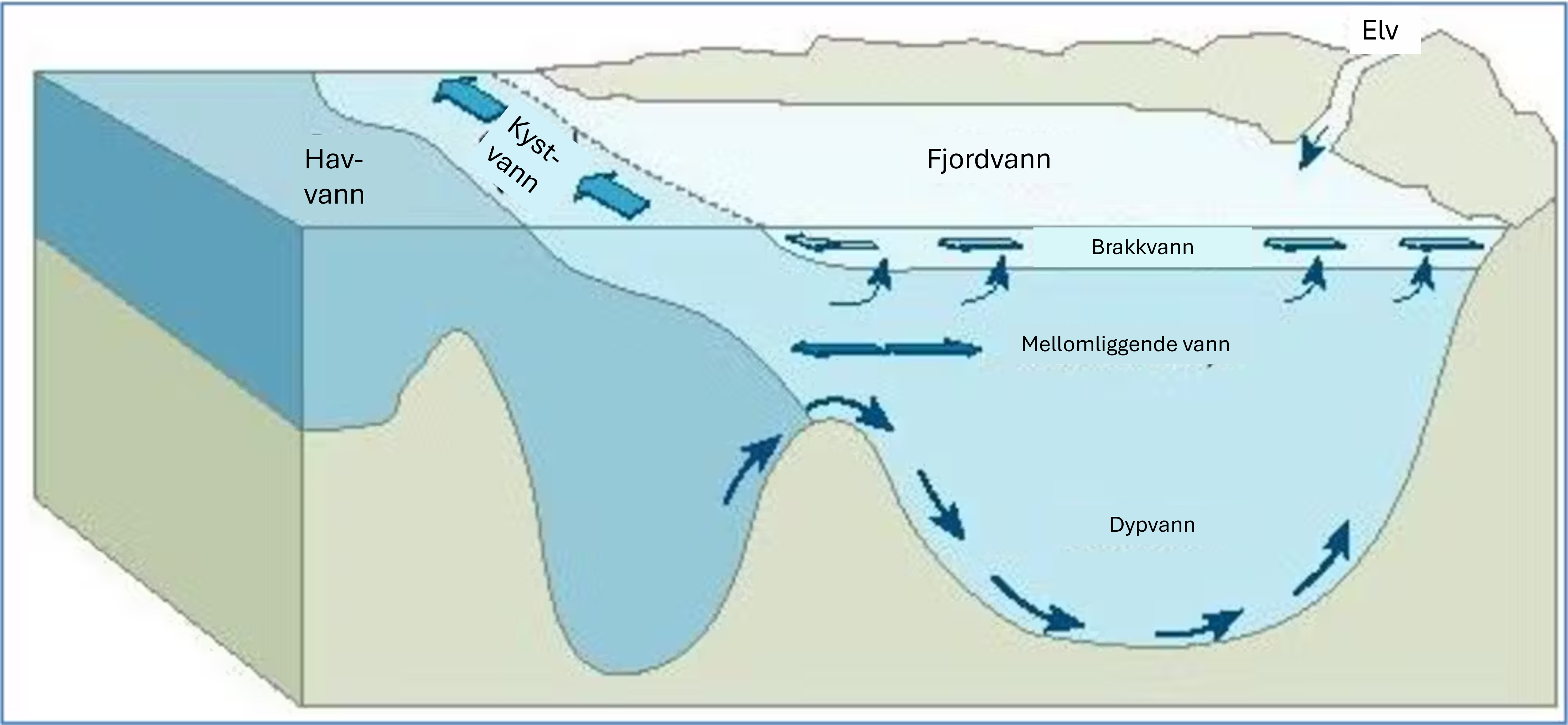 I figuren nedenfor ser du en skjematisk framstilling av hvordan havvann fordeler seg i fjorder. I høyre side av bildet ser du en elv som renner ut i fjorden, og at vannet som kommer fra elven, legger seg over de andre lagene med vann.