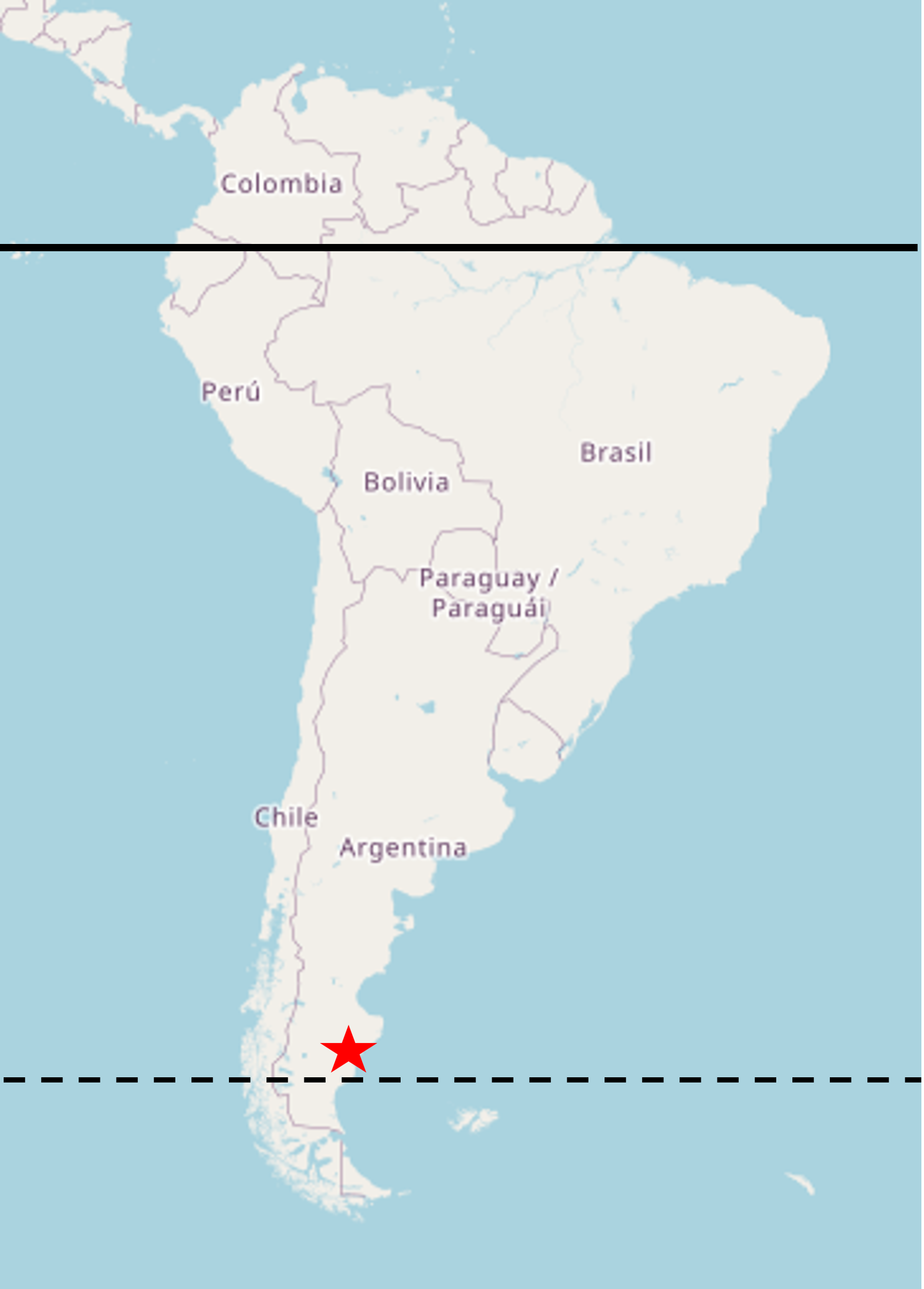Se på kartet over Sør-Amerika nedenfor. Den svarte, heltrukne linjen markerer ekvator. Den stiplede linjen markerer 45 grader sørlig breddegrad.