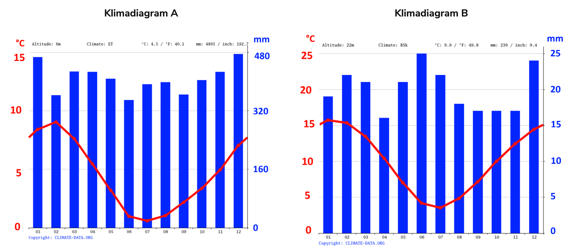 De to klimadiagrammene nedenfor viser temperatur (venstre akse og rød graf) og nedbør (høyre akse og blå søyler) i løpet av et år. Førsteaksen viser måned, der 01 betyr januar, 02 betyr februar, 03 betyr mars, og så videre. Andreaksen i rødt på venstre side viser temperatur i grader celsius, mens andreaksen i blått på høyre side viser nedbør i mm.