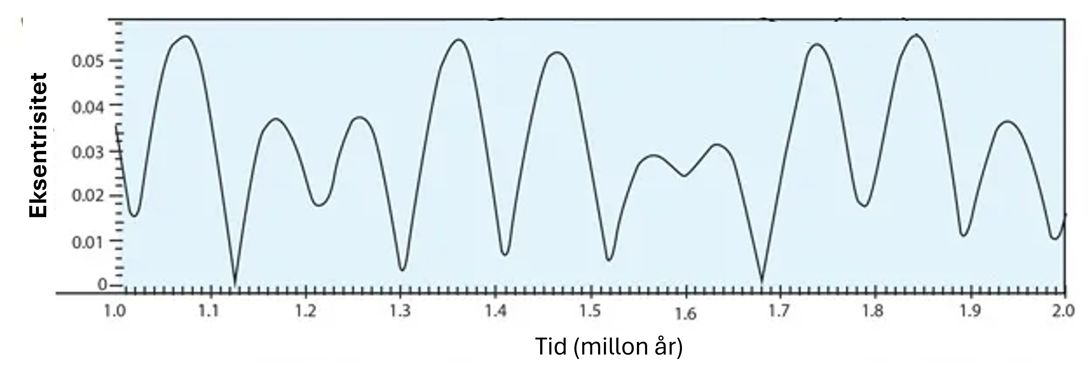 Figuren nedenfor viser hvordan jordbanens eksentrisitet har variert over perioden fra 1,0 til 2,0 millioner år siden.