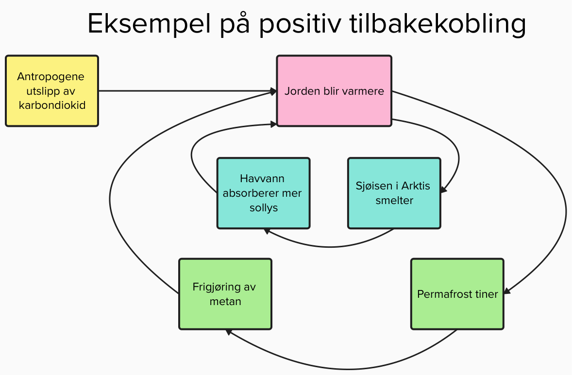 Et eksempel på positiv tilbakekobling er issmelting. Når is smelter, erstattes den hvite, reflekterende isoverflaten med mørkere land eller hav. Dette fører til at mindre sollys reflekteres og mer absorberes, noe som ytterligere øker oppvarmingen. En annen viktig positiv tilbakekobling er frigjøring av metan fra tundraområder når permafrosten tiner. Metan er en kraftig drivhusgass som forsterker drivhuseffekten og dermed bidrar til ytterligere oppvarming.