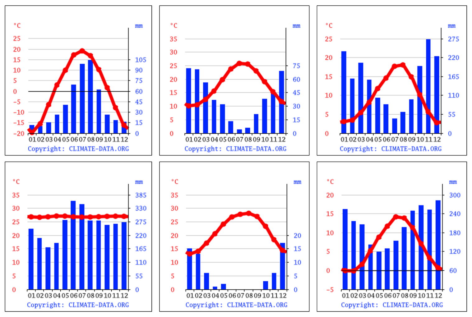 Nedanfor finn du 6 klimadiagram. På venstre side står temperaturen i gradar celcius, ført opp med raude tal. Desse tala korresponderer med den raude linja. På høgre side står nedbør i mm, ført opp med blå tal. På førsteaksen står dei ulike månadene.