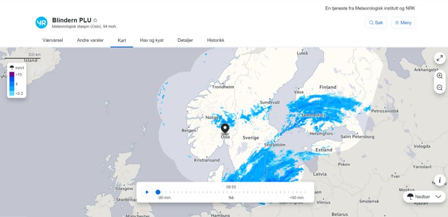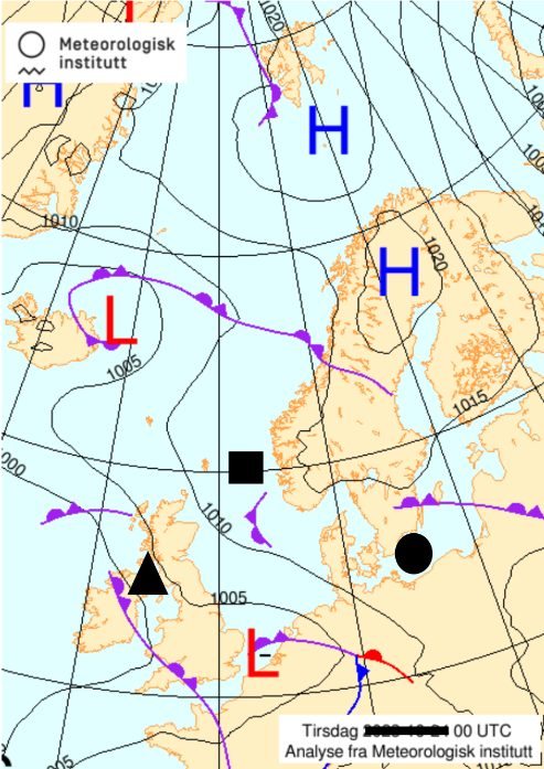 I dei ulike fanene nedanfor finn du informasjon, kart og bilete du treng for å svare på dei tre oppgåvene som står under fanene. Oppgåvene nedanfor handlar om vêret på Blindern ein tysdag. Alle karta og figurane som er merkte med «tysdag», refererer til den same tysdagen. Dei som er merkte med «måndag», refererer til dagen før tysdag.