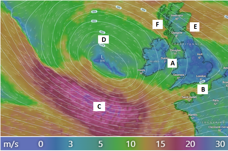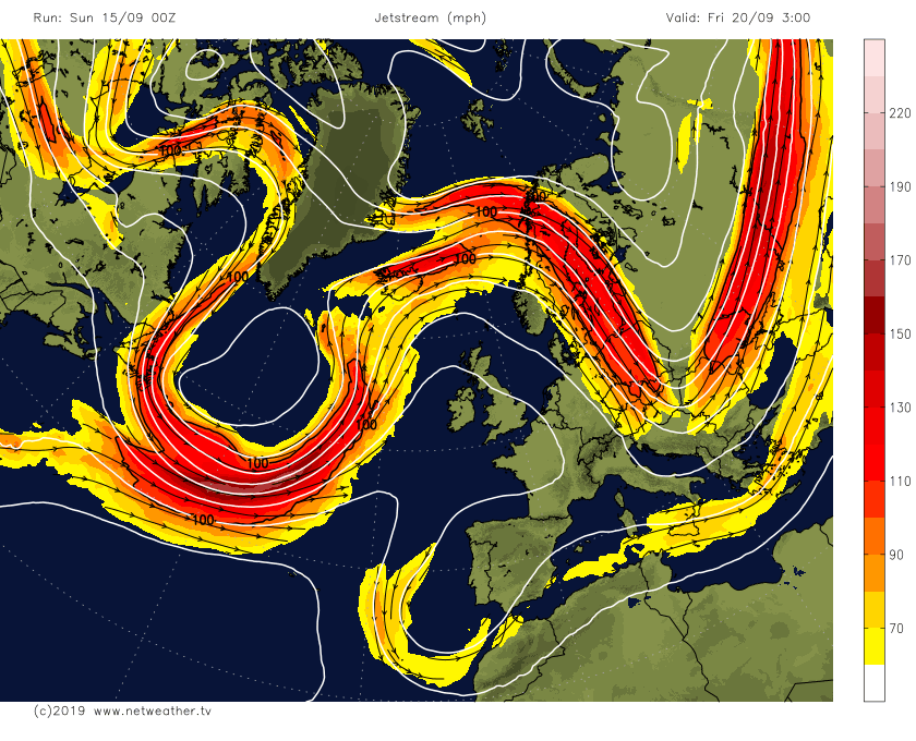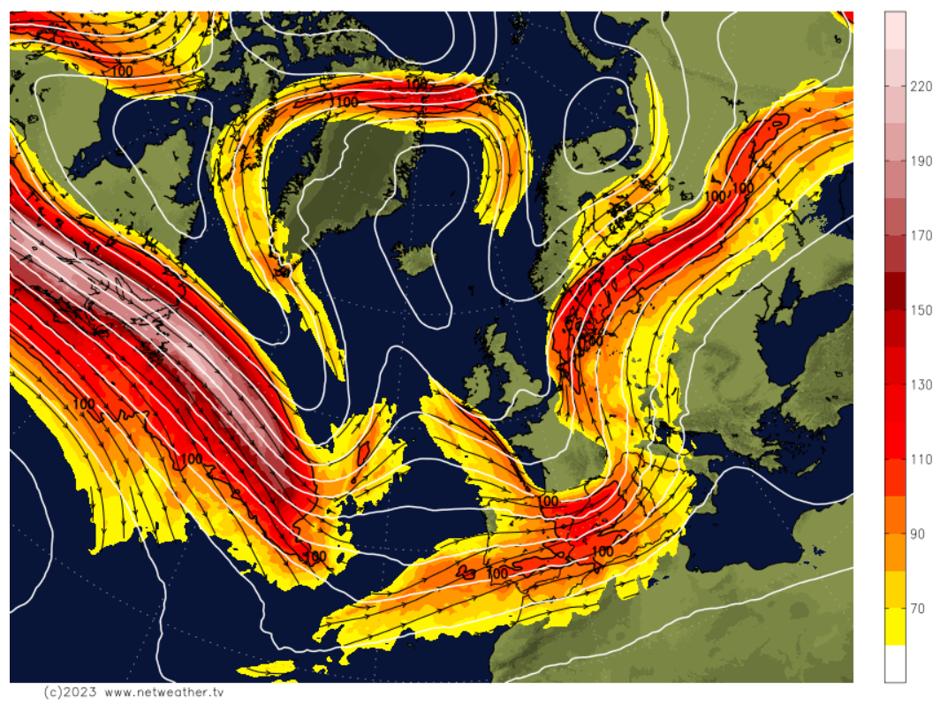 Figuren nedanfor viser jetstraumen ein vinterdag over dei nordlege delane av Europa. Dei ulike fargane viser hastigheita til vinden i mph (engelske mil per time) – sjå skala til høgre.
