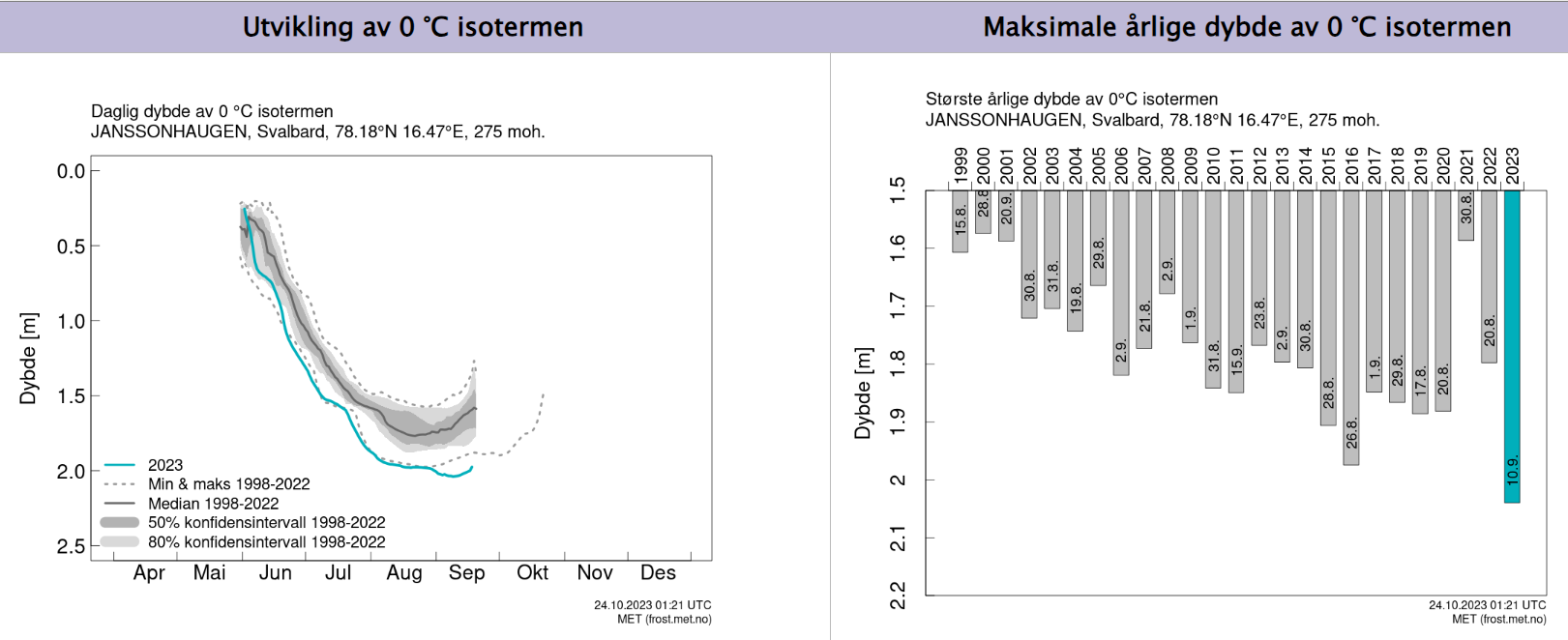 Figurane nedanfor viser djupna til nullgradarsisotermen frå eit borehòl på Jansonhaugen på Svalbard i tidsperioden 1998–2023.