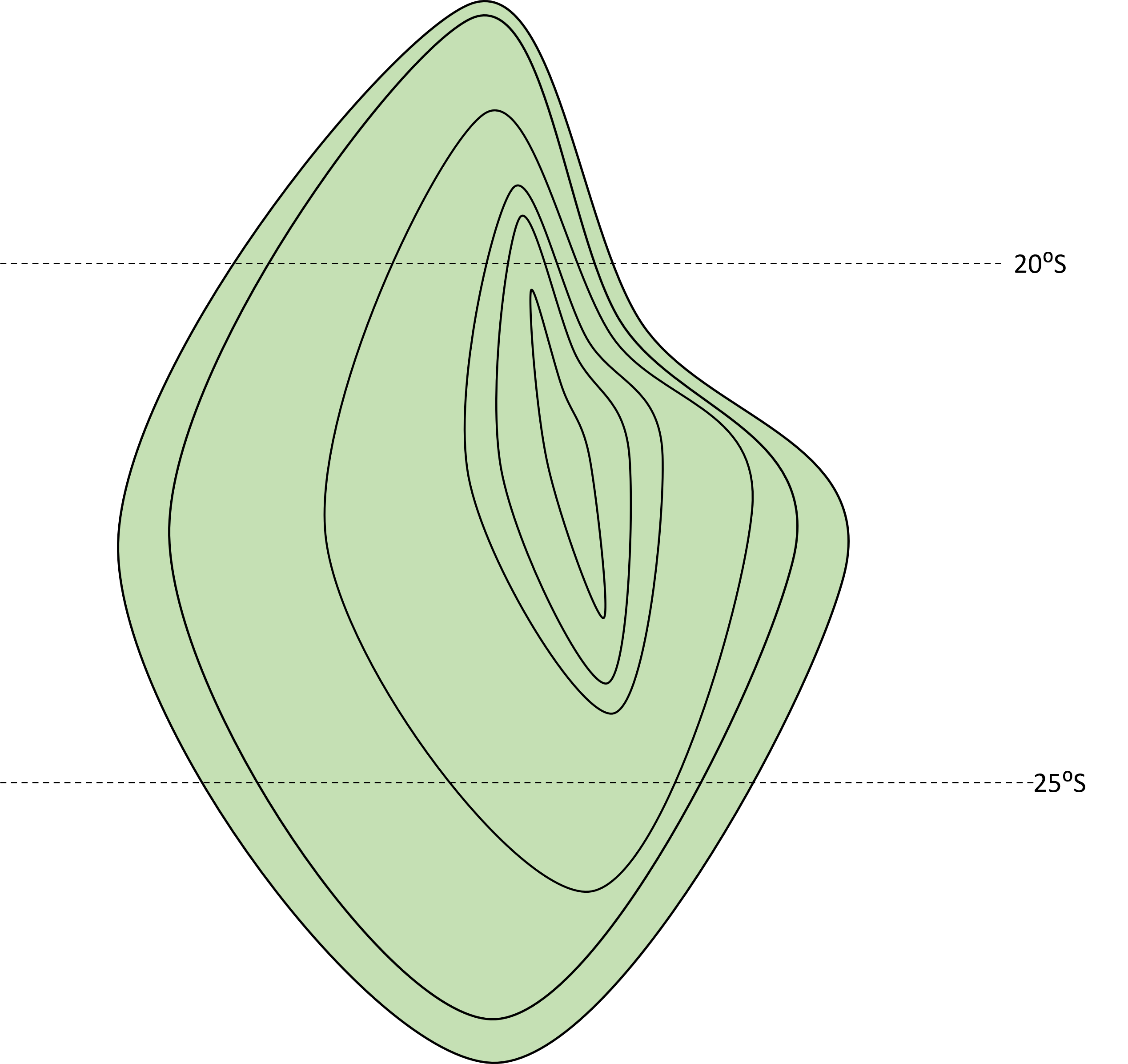På biletet nedanfor ser du eit kart over ei tenkt øy. Øya ligg ute i eit hav, langt frå land. Kartet har to horisontale stipla linjer. Den øvste viser 20 gradar sørleg breidd, og den nedste viser 25 gradar sørleg breidd. Dei svarte heiltrekte linjene er høgdekurver med ein ekvidistanse på 500 meter.