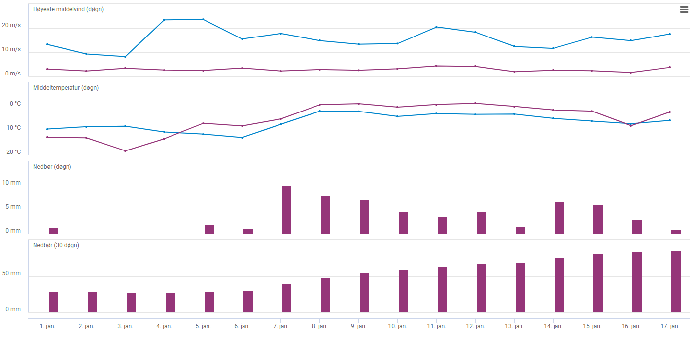 Figuren nedanfor viser meteorologiske data frå to målestasjonar i Trysil i tidsperioden 1. til 17. januar. Datoane er plasserte på førsteaksen. Øvste figur viser høgaste middelvind per døgn, med blå kurve for målestasjonen oppe på Trysilfjellet og raud kurve for målestasjonen nede i dalen. Nest øvste figur viser middeltemperaturen per døgn for dei same to målestasjonane, blå for Trysilfjellet og raud for dalen. Dei to nedste figurane handlar om målt nedbør i området. Nedbør (døgn) viser total nedbør per døgn. Nedbør (30 døgn) viser akkumulert nedbør.
