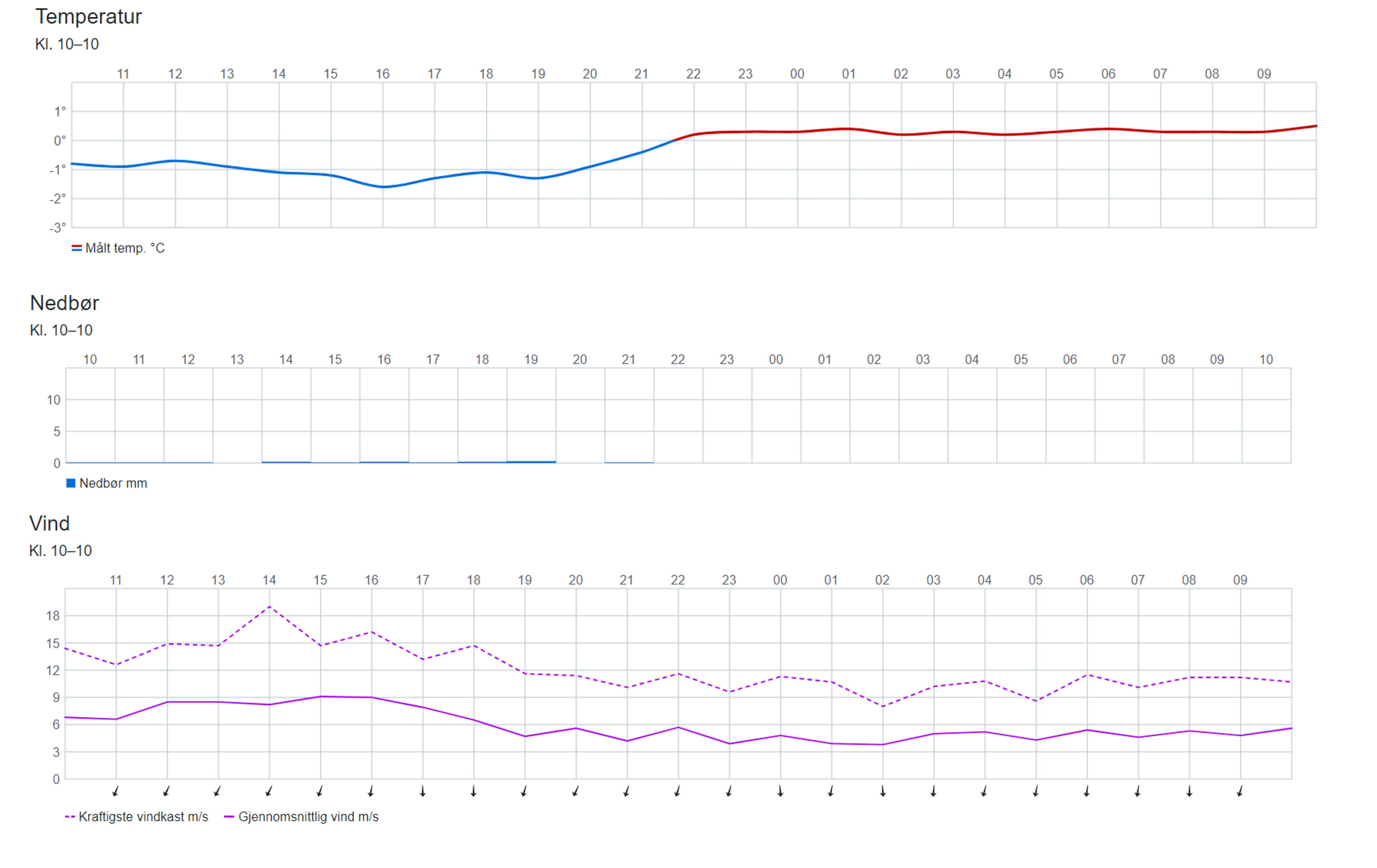 Her er måledata frå Blindern frå måndag klokka 10.00 til tysdag klokka 10.00. Øvste graf viser temperatur, den midtarste viser nedbør, og den nedste viser vind.