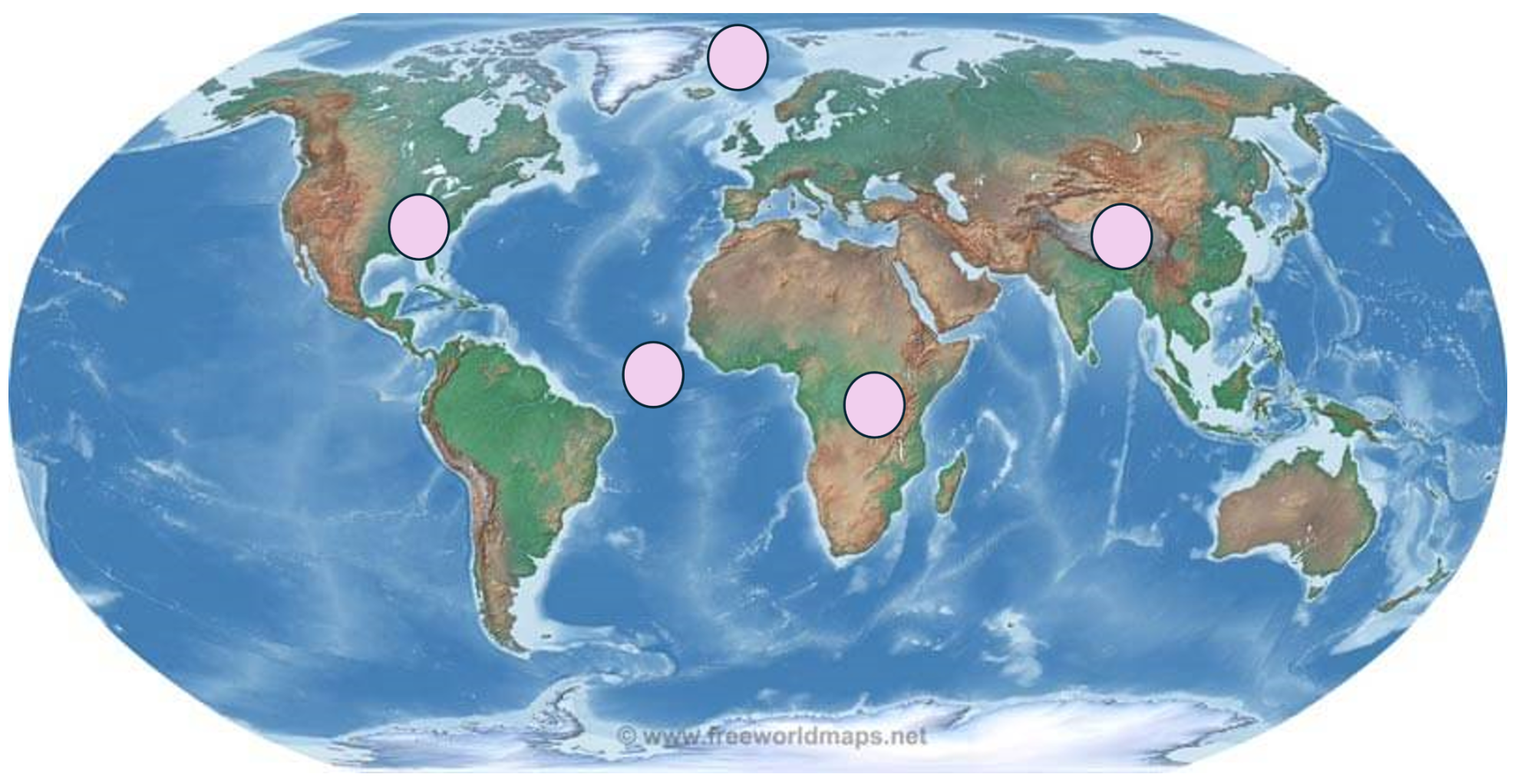 På verdenskartet nedenfor er det tegnet inn fem sirkler.