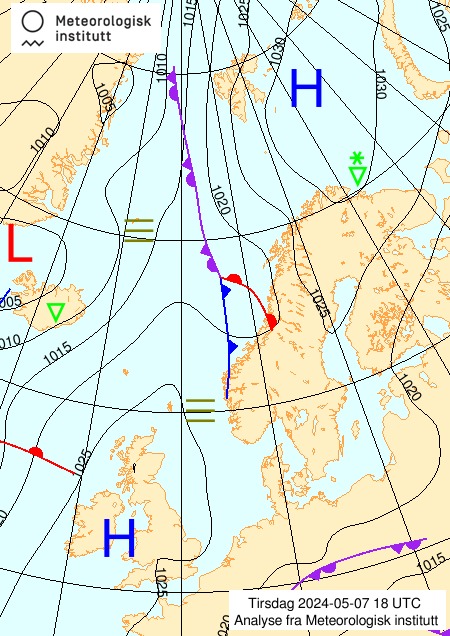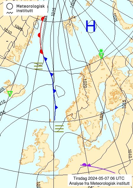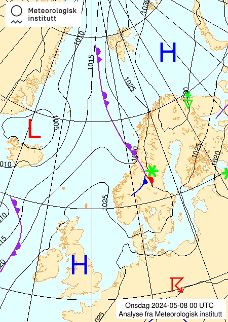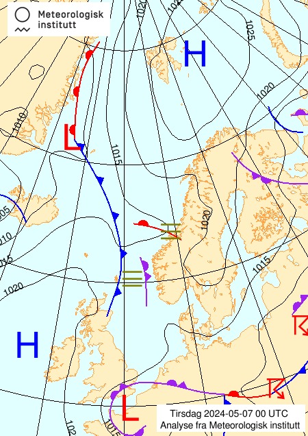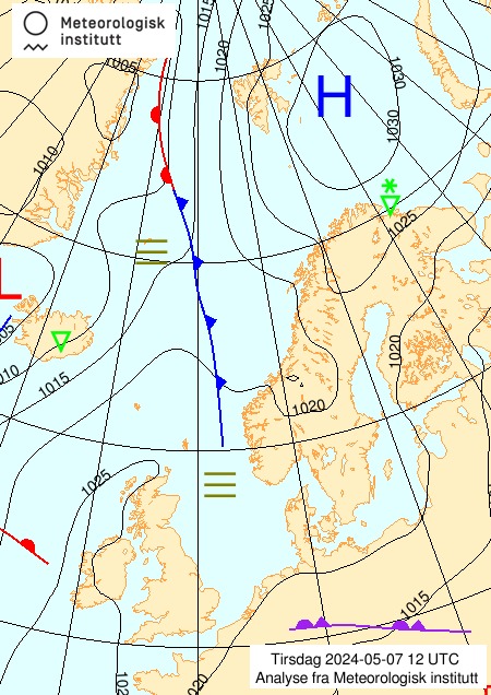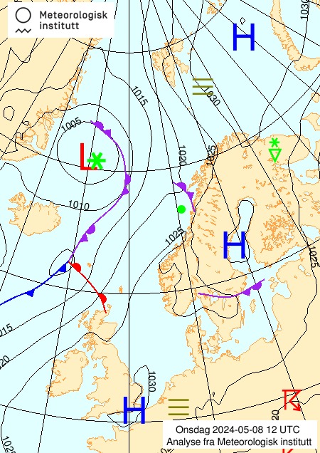 - Hvis vi da fokuserer på der hvor jeg, observatøren, er når jeg tolker kartene, så ser vi at det natt til tirsdag 7.mai kom inn noe rester av en okklusjonsfront fra Nordsjøen, etterfulgt av tåke. Vi ser at det ligger tåke ute over havområdene hele tirsdagen, og at det er lite vind hele denne dagen. Utover onsdag 8.mai etableres et lavtrykk ute i sørlige Norskehavet / Nordsjøen, sammen med et frontsystem. Vi ser at dette lavtrykket og frontene flytter seg nordøstover, og at varmfronten nærmer seg vestkysten og Øygarden. Dette betyr at jeg vil forvente at jeg utenfor vil se et skyopptrekk som er typisk foran varmfronter. Jeg forventer at jeg først ser fjærskyer cirrus etterfulgt av høye lagskyer cirrustratus. Etterhvert blir skyene lavere og lavere, lagskyer altostratus, og nedbørsskylag nimbostratus. Jeg forventer altså at det etterhvert blir mer og mer skyet, og at det vil komme nedbør. En stund etter at det har begynt på regne, forventer jeg at varmfronten passerer, og at temperaturen går litt opp.