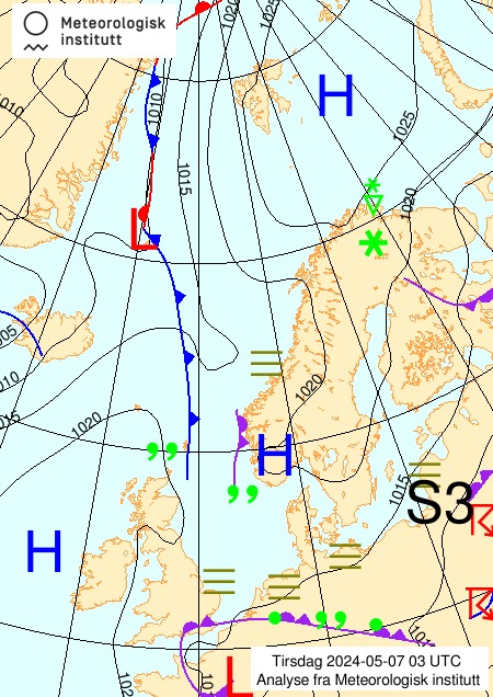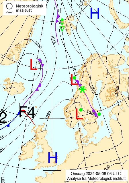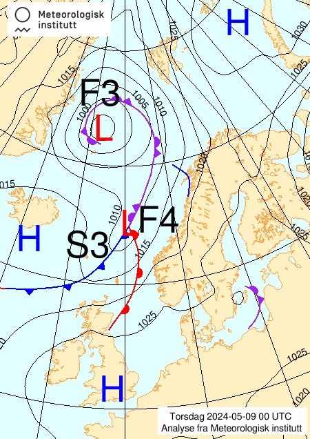 - Vi har tre områder som er markert med F4, S3 og F3. Dette er områder som har hatt store trykkendringer siste tre timer. F4 betyr at trykket har falt med 4 hPa de siste tre timer. Tilsvarende betyr S3 at trykket har steget med 3 hPa de siste tre timer. Dette forteller oss at lavtrykkssenteret i Norskehavet er på vei nordøstover, mens lavtrykkssenteret i Grønlandshavet er på vei nordover.
