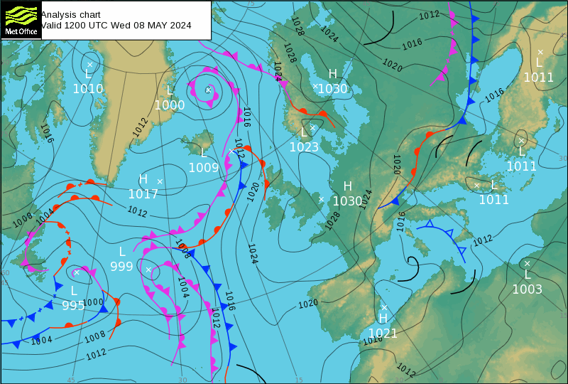 Analysekartene fra met.no viser et ganske lite utsnitt av værsystemene som kan påvirke oss. Husk at værsystemene kan flytte seg raskt, og hvis vi ønsker å se mønsteret i hvor “været kommer fra”, så kan det være nyttig å studere analysekart over et større område. Metoffice i UK har sitt hovedsete i Reading. Her finner vi også hovedsenteret for langtidsvarsel for Europa. Det kan derfor være nyttig å se på hvordan analysekartene ser ut herfra. Disse kartene kommer ikke like ofte som analysekartene fra met.no, og kartene blir ikke liggende ute i ettertid, da må man laste dem ned etterhvert. Den store fordelen med å se på de større kartene fra UK, sammen med de norske, er at de viser større deler av Nord-Atlanterer, hvor vi vet at mye av den frontaktiviteten som skjer her, vil kunne påvirke været i Norge. I tillegg ser vi hele Europa, og deler av Russland, som også kan påvirke østfra.