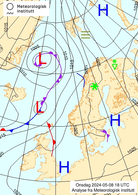 - Det første vi ser de to lavtrykkssentrene i Norskehavet og Grønlandshavet, samt høytrykksentrene sør i Storbrittania og på sørsiden av Island.